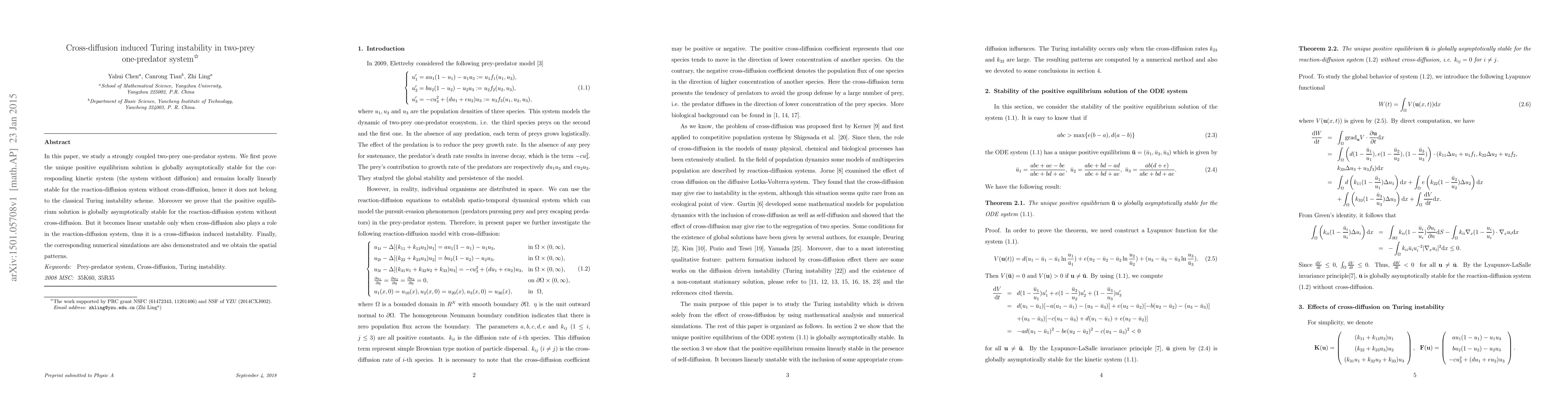 This paper investigates the dynamics of a two-prey one-predator system, proving that the unique positive equilibrium is stable without diffusion or standard diffusion but becomes unstable due to cross-diffusion, leading to Turing instability and spatial pattern formation. Numerical simulations confirm these theoretical findings.