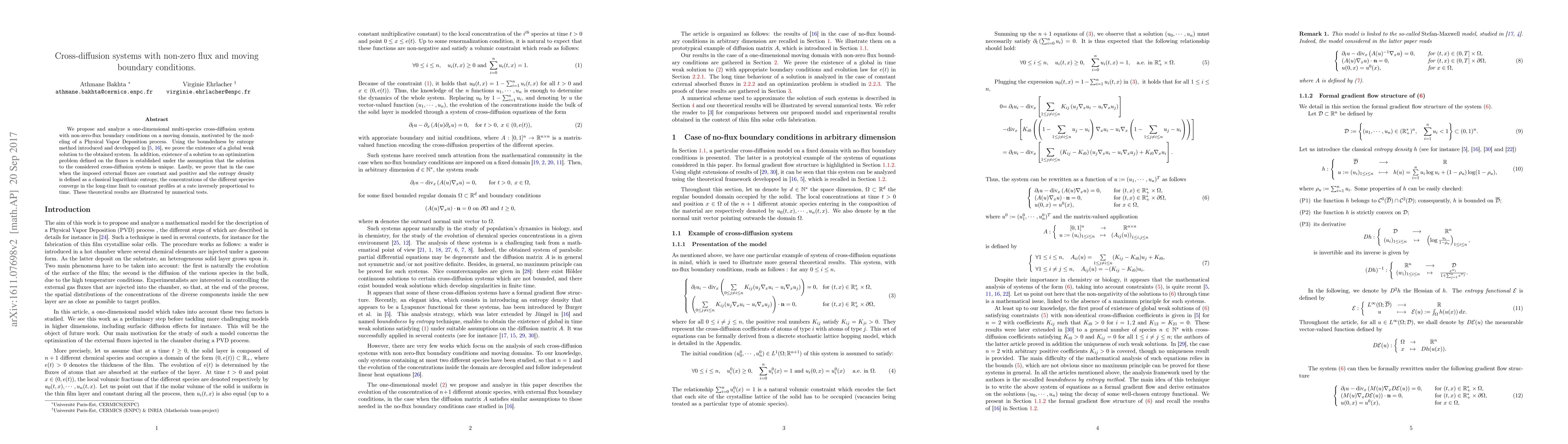 We propose and analyze a one-dimensional multi-species cross-diffusion system with non-zero-flux boundary conditions on a moving domain, motivated by the mod- eling of a Physical Vapor Deposition process. Using the boundedness by entropy method, we prove the existence of a global weak solution to the obtained system. In addition, existence of a solution to an optimal control problem defined on the fluxes is established under the assumption that the solution to the considered cross-diffusion system is unique. Lastly, we prove that in the case when the imposed external fluxes are constant and positive and the entropy density is defined as a classical logarithmic entropy, the concentrations of the dif- ferent species converge in the long-time limit to constant profiles at a rate inversely proportional to time. These theoretical results are illustrated by numerical tests.