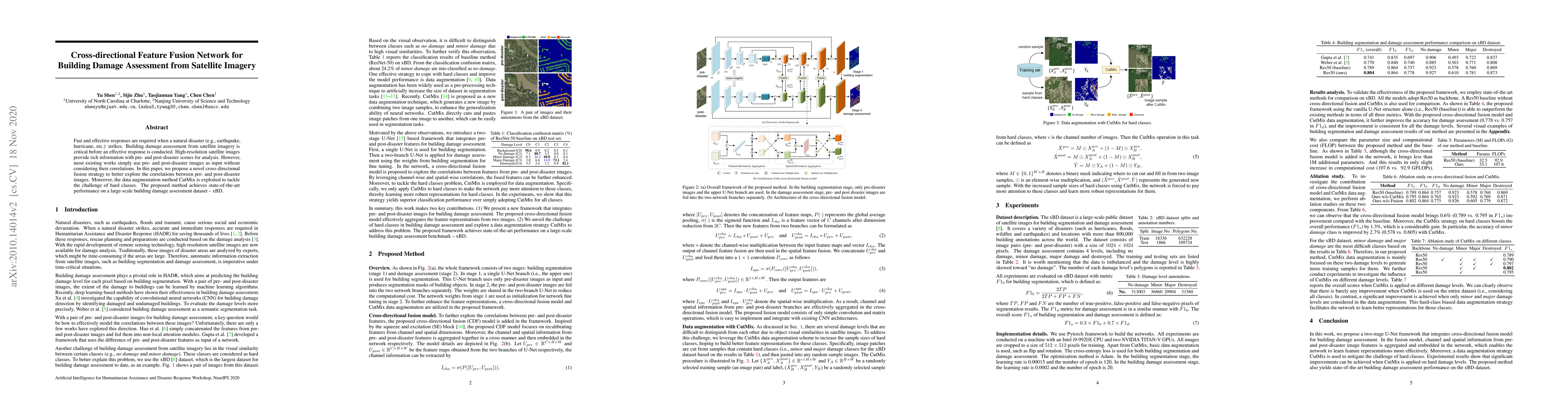This paper introduces a cross-directional feature fusion network to assess building damage from satellite imagery, leveraging correlations between pre- and post-disaster images. It employs CutMix data augmentation to handle difficult classification cases, achieving top performance on the xBD dataset.