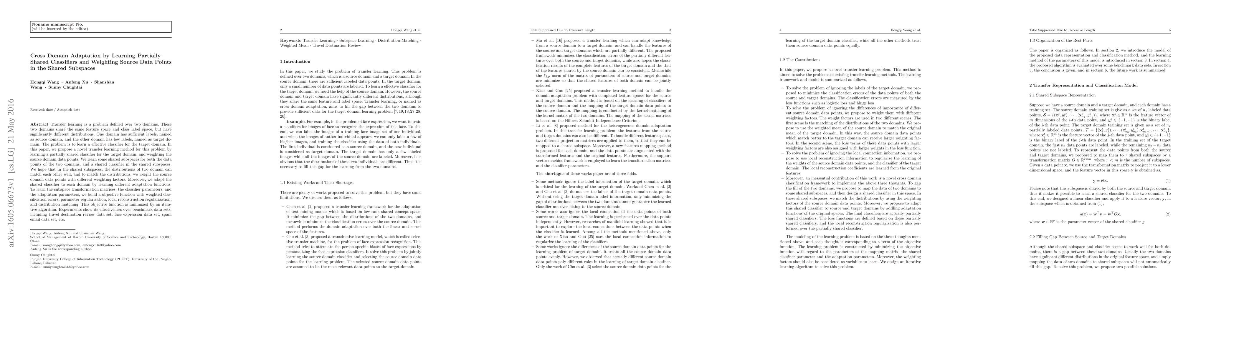 Transfer learning is a problem defined over two domains. These two domains share the same feature space and class label space, but have significantly different distributions. One domain has sufficient labels, named as source domain, and the other domain has few labels, named as target do- main. The problem is to learn a effective classifier for the target domain. In this paper, we propose a novel transfer learning method for this problem by learning a partially shared classifier for the target domain, and weighting the source domain data points. We learn some shared subspaces for both the data points of the two domains, and a shared classifier in the shared subspaces. We hope that in the shared subspaces, the distributions of two domain can match each other well, and to match the distributions, we weight the source domain data points with different weighting factors. Moreover, we adapt the shared classifier to each domain by learning different adaptation functions. To learn the subspace transformation matrices, the classifier parameters, and the adaptation parameters, we build a objective function with weighted clas- sification errors, parameter regularization, local reconstruction regularization, and distribution matching. This objective function is minimized by an itera- tive algorithm. Experiments show its effectiveness over benchmark data sets, including travel destination review data set, face expression data set, spam email data set, etc.