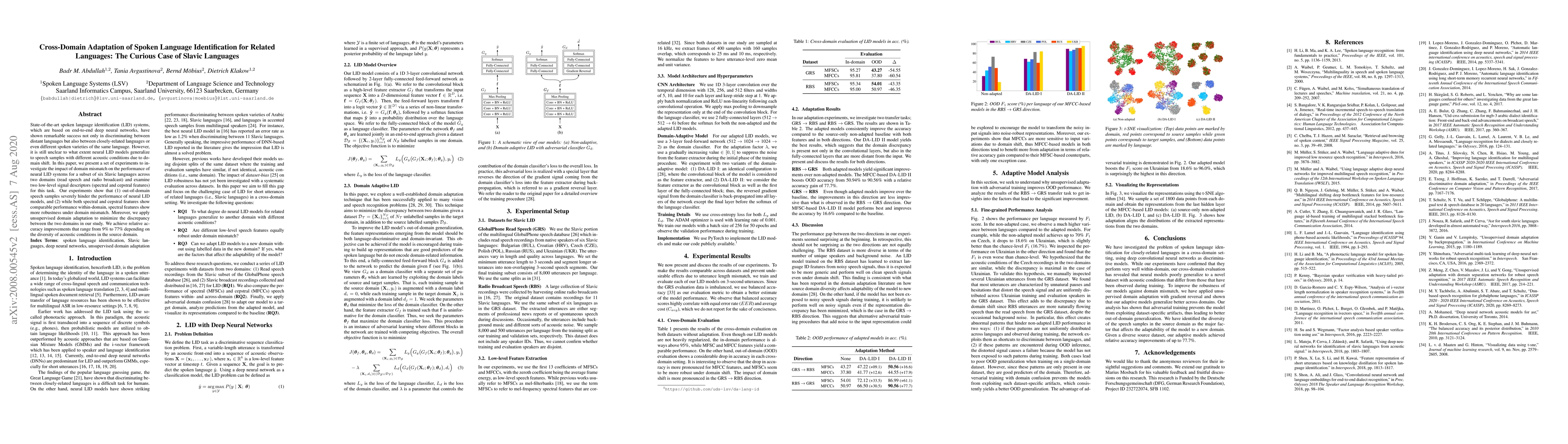State-of-the-art spoken language identification (LID) systems, which are based on end-to-end deep neural networks, have shown remarkable success not only in discriminating between distant languages but also between closely-related languages or even different spoken varieties of the same language. However, it is still unclear to what extent neural LID models generalize to speech samples with different acoustic conditions due to domain shift. In this paper, we present a set of experiments to investigate the impact of domain mismatch on the performance of neural LID systems for a subset of six Slavic languages across two domains (read speech and radio broadcast) and examine two low-level signal descriptors (spectral and cepstral features) for this task. Our experiments show that (1) out-of-domain speech samples severely hinder the performance of neural LID models, and (2) while both spectral and cepstral features show comparable performance within-domain, spectral features show more robustness under domain mismatch. Moreover, we apply unsupervised domain adaptation to minimize the discrepancy between the two domains in our study. We achieve relative accuracy improvements that range from 9% to 77% depending on the diversity of acoustic conditions in the source domain.