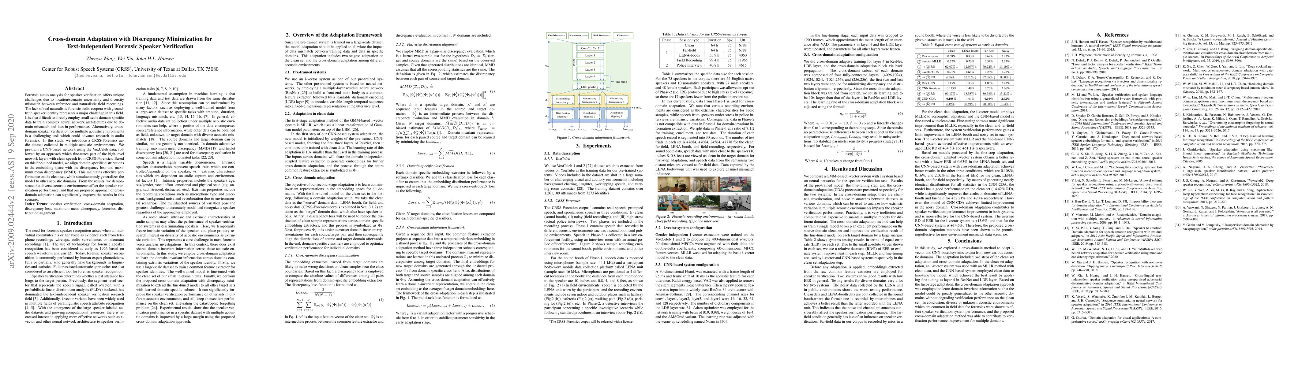 This paper presents a cross-domain adaptation method for text-independent forensic speaker verification using discrepancy minimization. The study introduces a new CRSS-Forensics dataset and fine-tunes a CNN-based network with domain-specific data, achieving improved performance across diverse acoustic environments.