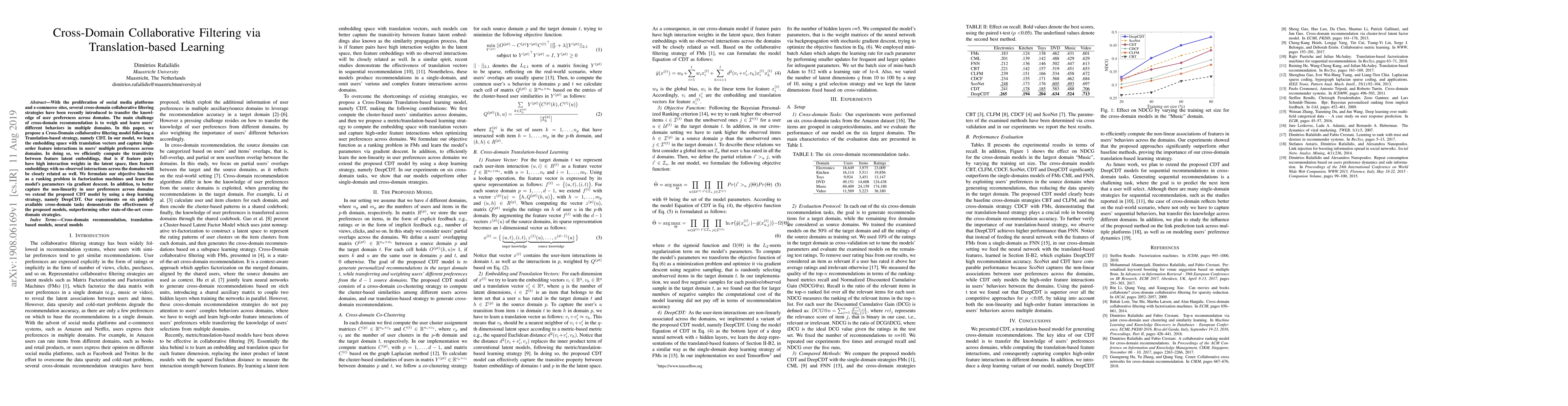 This paper proposes a Translation-based Cross-Domain Collaborative Filtering model (CDT) that leverages translation vectors to learn embedding spaces and high-order feature interactions across multiple domains. The DeepCDT extension further enhances non-linearity, achieving superior performance on six cross-domain recommendation tasks.