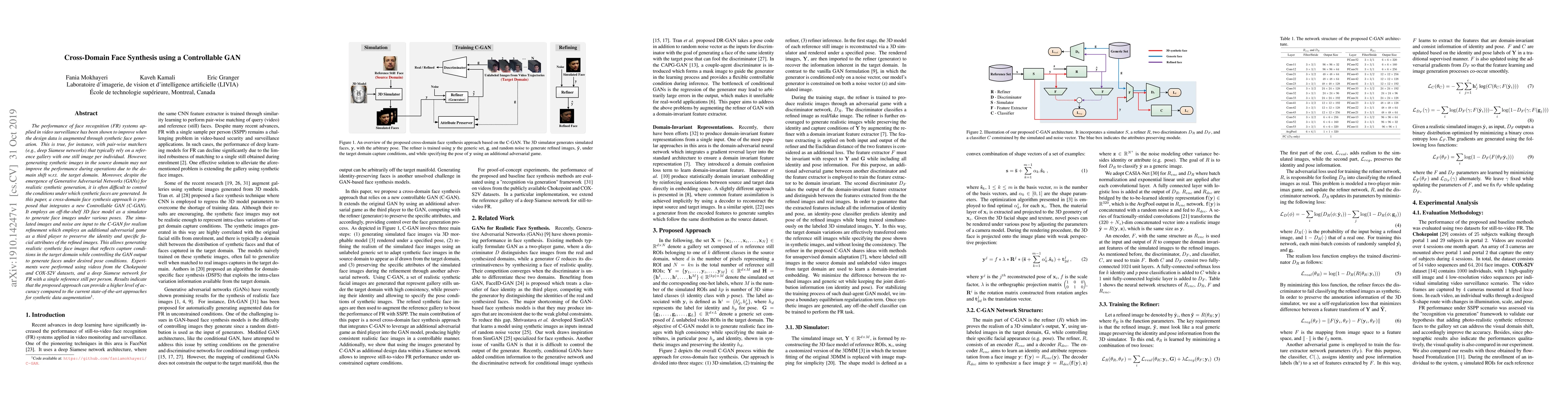 This paper proposes a cross-domain face synthesis method using a Controllable GAN (C-GAN) to generate realistic synthetic faces under various poses, addressing domain shift issues. The C-GAN refines images from a 3D face model simulator and uses an adversarial game to maintain identity and facial attributes, achieving higher accuracy in face recognition compared to existing methods.