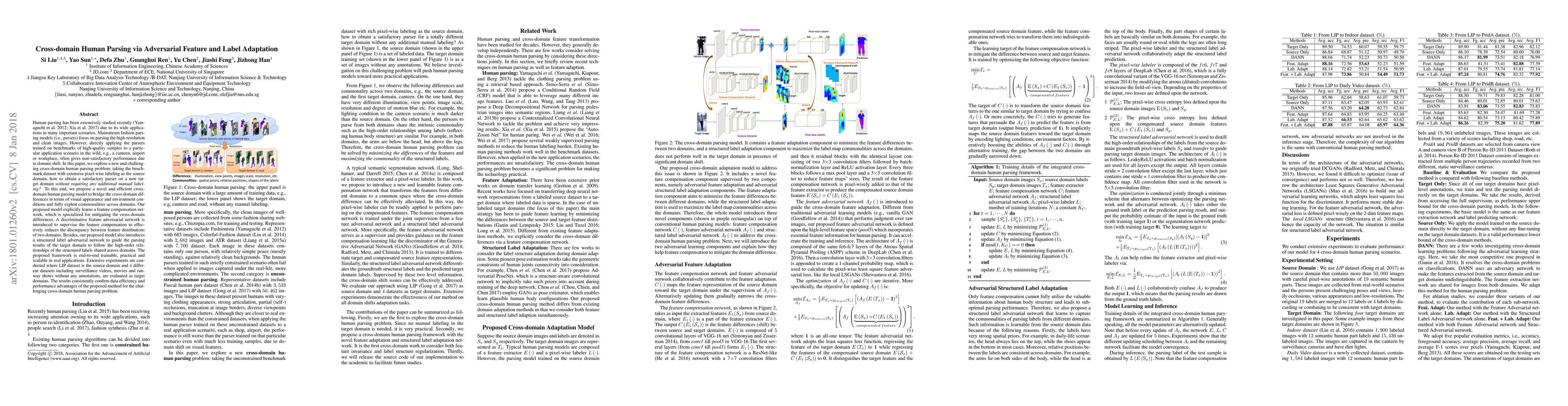 This paper proposes a novel cross-domain human parsing model that leverages adversarial feature and label adaptation to bridge the gap between benchmark datasets and real-world scenarios without requiring additional manual labeling. The model includes a feature compensation network and adversarial training to reduce domain discrepancies and maintain high-order label relationships, demonstrating improved performance across various target domains.