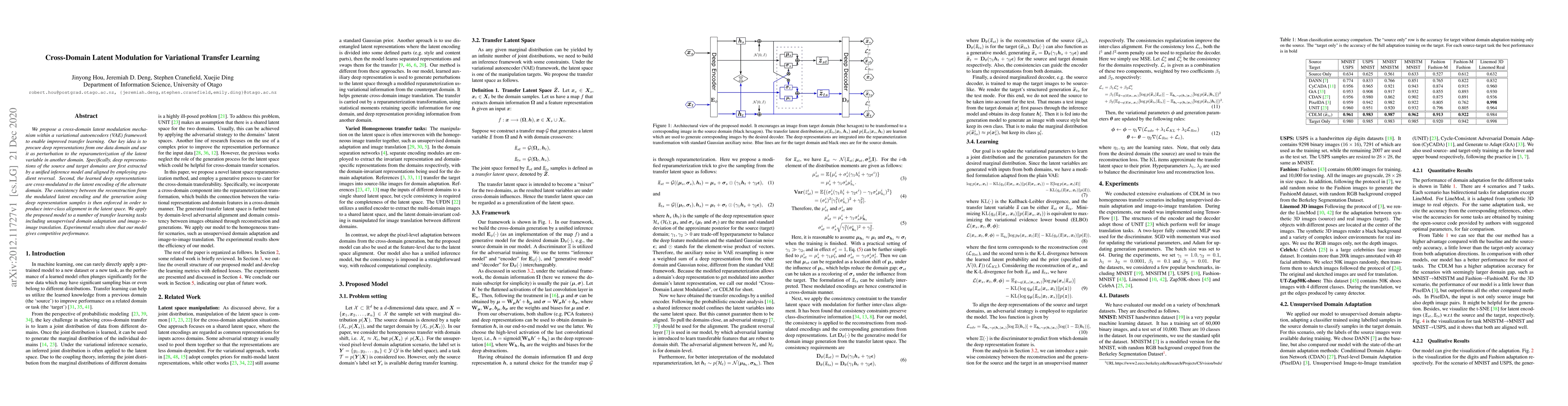 This paper proposes a cross-domain latent modulation mechanism within a VAE framework to enhance transfer learning by aligning deep representations from source and target domains through gradient reversal and modulating latent variables for inter-class alignment, achieving competitive performance in various transfer learning tasks.