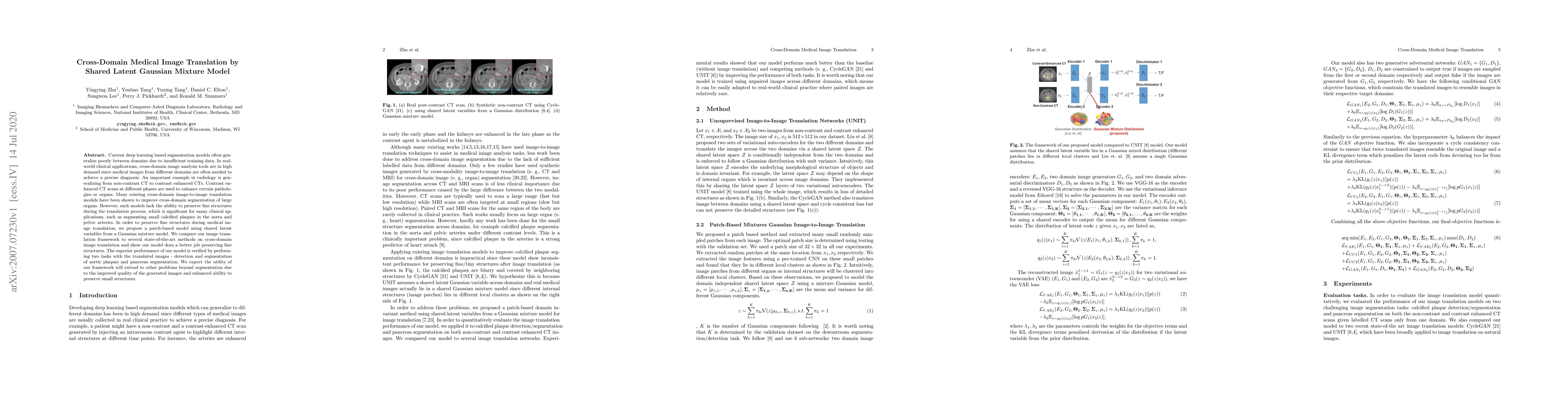 Current deep learning based segmentation models often generalize poorly between domains due to insufficient training data. In real-world clinical applications, cross-domain image analysis tools are in high demand since medical images from different domains are often needed to achieve a precise diagnosis. An important example in radiology is generalizing from non-contrast CT to contrast enhanced CTs. Contrast enhanced CT scans at different phases are used to enhance certain pathologies or organs. Many existing cross-domain image-to-image translation models have been shown to improve cross-domain segmentation of large organs. However, such models lack the ability to preserve fine structures during the translation process, which is significant for many clinical applications, such as segmenting small calcified plaques in the aorta and pelvic arteries. In order to preserve fine structures during medical image translation, we propose a patch-based model using shared latent variables from a Gaussian mixture model. We compare our image translation framework to several state-of-the-art methods on cross-domain image translation and show our model does a better job preserving fine structures. The superior performance of our model is verified by performing two tasks with the translated images - detection and segmentation of aortic plaques and pancreas segmentation. We expect the utility of our framework will extend to other problems beyond segmentation due to the improved quality of the generated images and enhanced ability to preserve small structures.