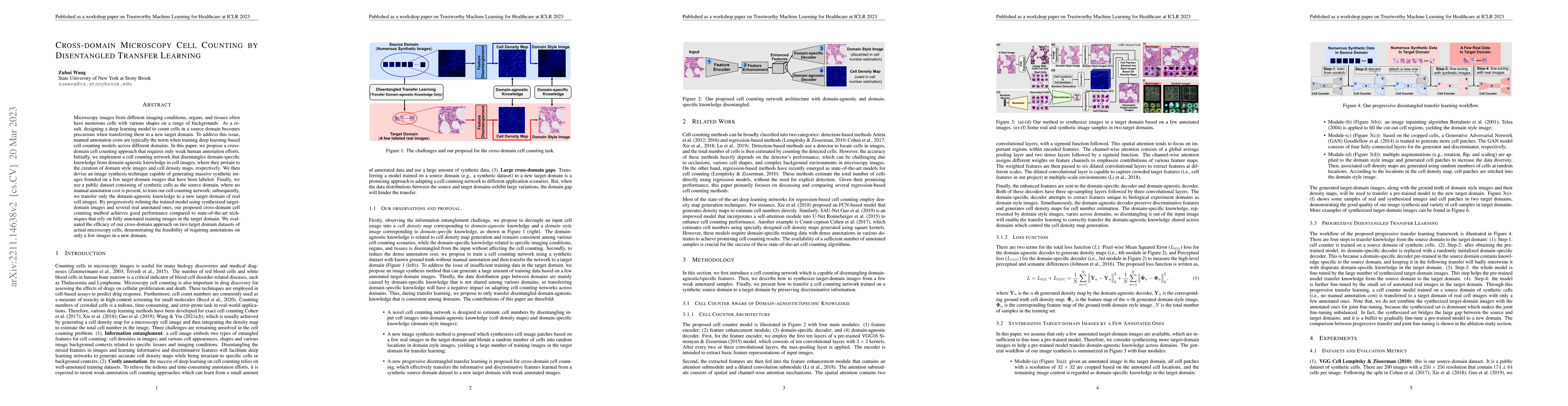 This paper proposes a cross-domain cell counting method using disentangled transfer learning that requires minimal human annotation. It trains a network to separate domain-specific and domain-agnostic knowledge, synthesizes images for the target domain, and transfers domain-agnostic knowledge to achieve effective cell counting with few annotations.