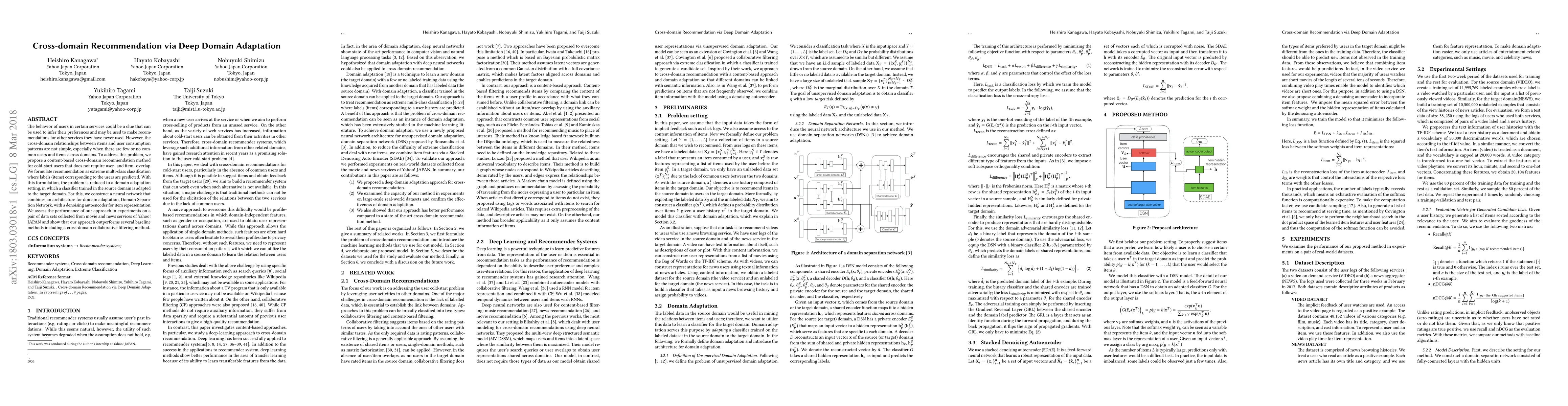 This paper proposes a deep domain adaptation method for cross-domain recommendation, leveraging content-based approaches for cold-start users without requiring overlap between domains. The method combines a Domain Separation Network with a denoising autoencoder, achieving superior performance over baseline methods in experiments on Yahoo! JAPAN's movie and news datasets.