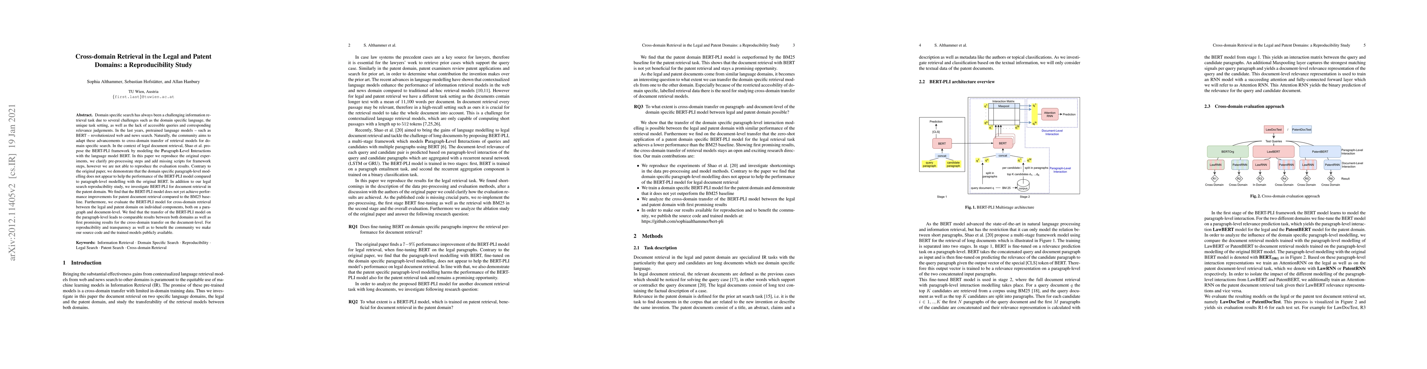 Domain specific search has always been a challenging information retrieval task due to several challenges such as the domain specific language, the unique task setting, as well as the lack of accessible queries and corresponding relevance judgements. In the last years, pretrained language models, such as BERT, revolutionized web and news search. Naturally, the community aims to adapt these advancements to cross-domain transfer of retrieval models for domain specific search. In the context of legal document retrieval, Shao et al. propose the BERT-PLI framework by modeling the Paragraph Level Interactions with the language model BERT. In this paper we reproduce the original experiments, we clarify pre-processing steps, add missing scripts for framework steps and investigate different evaluation approaches, however we are not able to reproduce the evaluation results. Contrary to the original paper, we demonstrate that the domain specific paragraph-level modelling does not appear to help the performance of the BERT-PLI model compared to paragraph-level modelling with the original BERT. In addition to our legal search reproducibility study, we investigate BERT-PLI for document retrieval in the patent domain. We find that the BERT-PLI model does not yet achieve performance improvements for patent document retrieval compared to the BM25 baseline. Furthermore, we evaluate the BERT-PLI model for cross-domain retrieval between the legal and patent domain on individual components, both on a paragraph and document-level. We find that the transfer of the BERT-PLI model on the paragraph-level leads to comparable results between both domains as well as first promising results for the cross-domain transfer on the document-level. For reproducibility and transparency as well as to benefit the community we make our source code and the trained models publicly available.