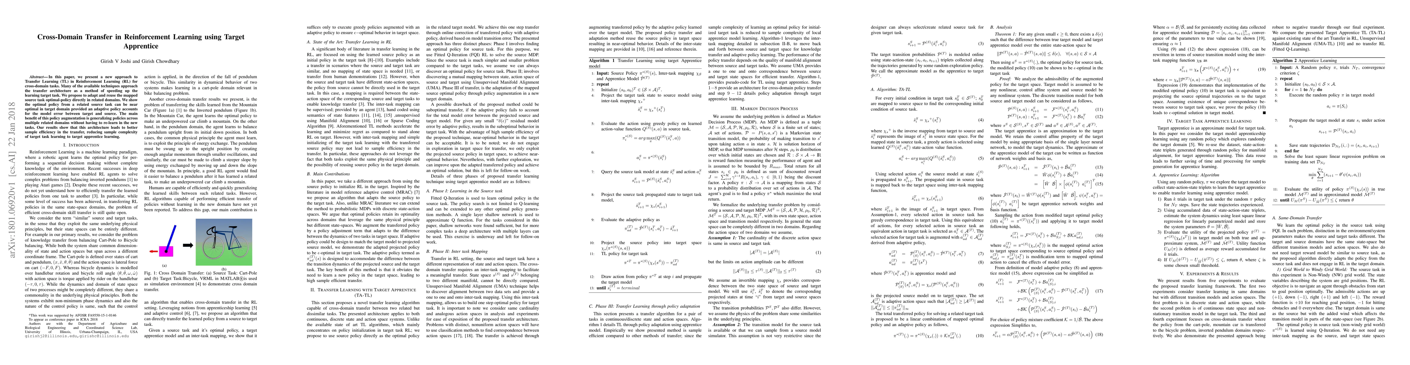 In this paper, we present a new approach to Transfer Learning (TL) in Reinforcement Learning (RL) for cross-domain tasks. Many of the available techniques approach the transfer architecture as a method of speeding up the target task learning. We propose to adapt and reuse the mapped source task optimal-policy directly in related domains. We show the optimal policy from a related source task can be near optimal in target domain provided an adaptive policy accounts for the model error between target and source. The main benefit of this policy augmentation is generalizing policies across multiple related domains without having to re-learn the new tasks. Our results show that this architecture leads to better sample efficiency in the transfer, reducing sample complexity of target task learning to target apprentice learning.