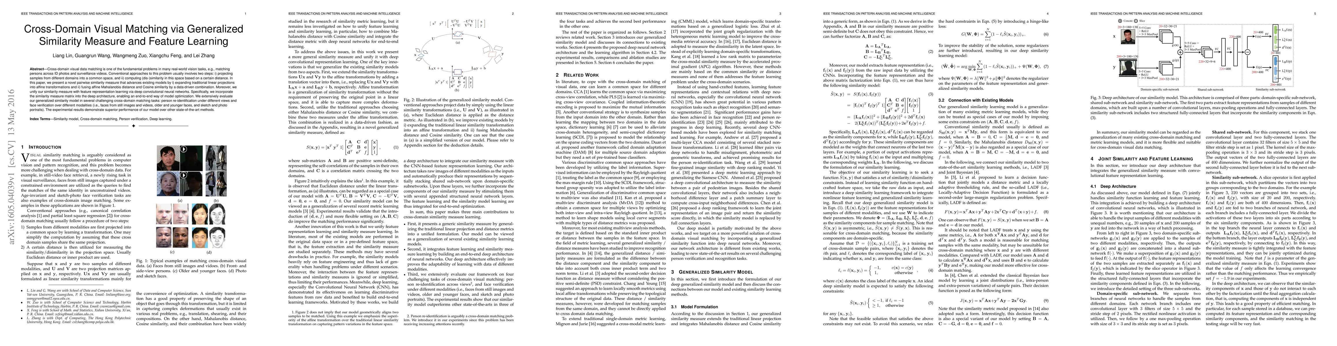 Cross-domain visual data matching is one of the fundamental problems in many real-world vision tasks, e.g., matching persons across ID photos and surveillance videos. Conventional approaches to this problem usually involves two steps: i) projecting samples from different domains into a common space, and ii) computing (dis-)similarity in this space based on a certain distance. In this paper, we present a novel pairwise similarity measure that advances existing models by i) expanding traditional linear projections into affine transformations and ii) fusing affine Mahalanobis distance and Cosine similarity by a data-driven combination. Moreover, we unify our similarity measure with feature representation learning via deep convolutional neural networks. Specifically, we incorporate the similarity measure matrix into the deep architecture, enabling an end-to-end way of model optimization. We extensively evaluate our generalized similarity model in several challenging cross-domain matching tasks: person re-identification under different views and face verification over different modalities (i.e., faces from still images and videos, older and younger faces, and sketch and photo portraits). The experimental results demonstrate superior performance of our model over other state-of-the-art methods.
