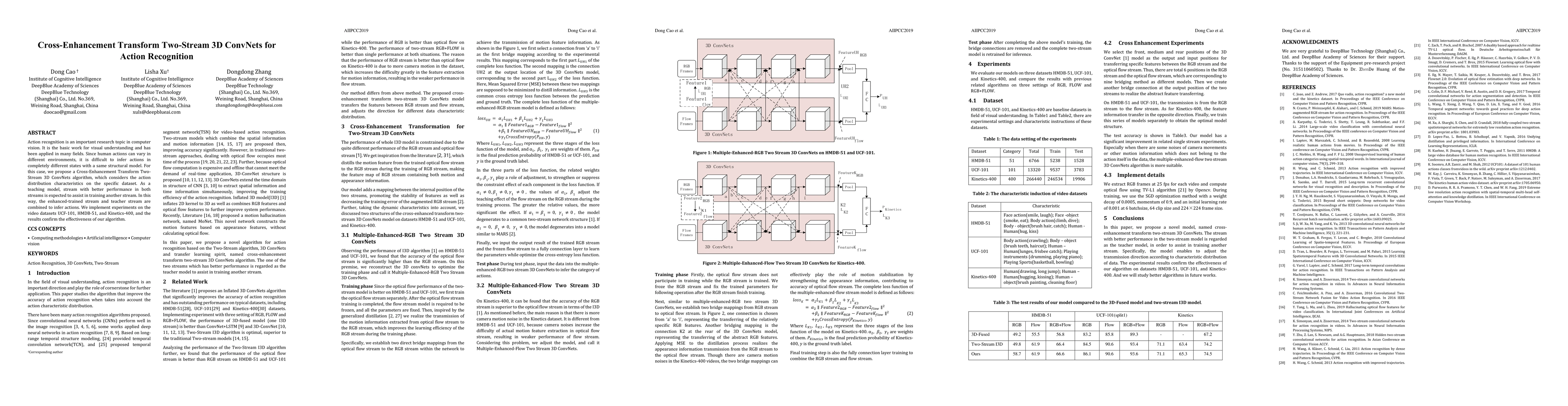 This paper proposes a Cross-Enhancement Transform Two-Stream 3D ConvNets algorithm for action recognition, leveraging one stream to assist in training the other to improve performance. Experiments on UCF-101, HMDB-51, and Kinetics-400 datasets demonstrate the effectiveness of the proposed method.
