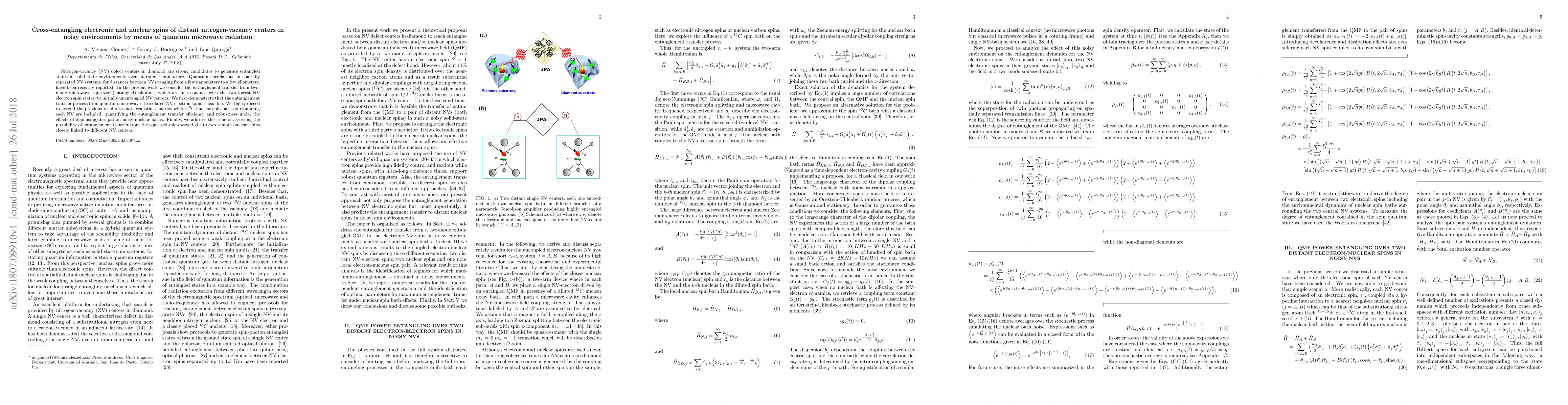 This research demonstrates the feasibility of transferring entanglement from quantum microwave photons to nitrogen-vacancy (NV) centers in diamond, even in noisy environments, and explores the robustness of this process against dephasing due to surrounding nuclear spin baths. The study also investigates entanglement transfer efficiency between nuclear spins linked to separate NV centers.