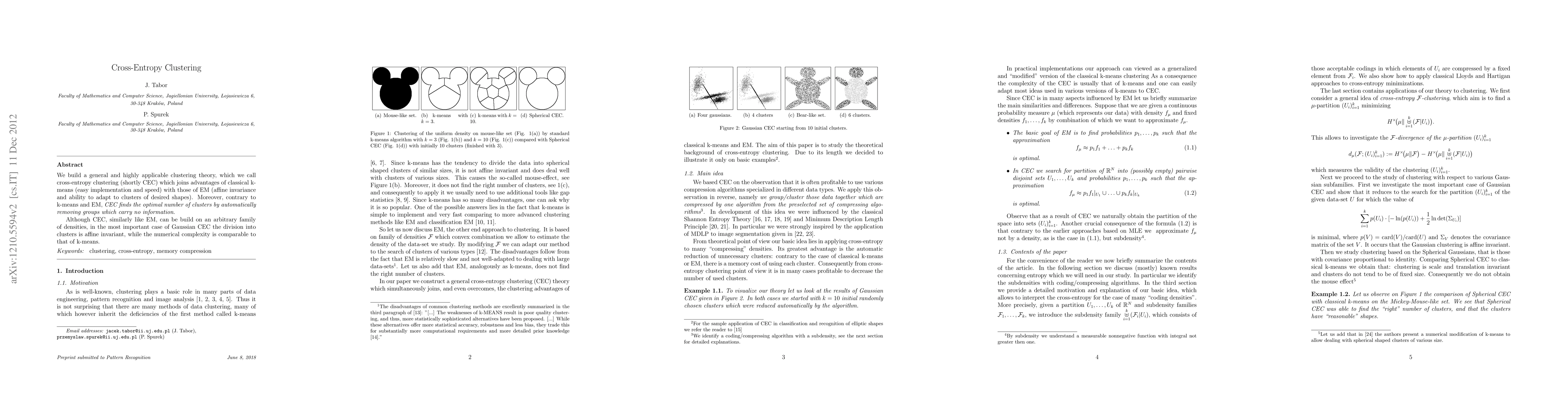 Cross-entropy clustering (CEC) theory optimally determines the number of clusters by eliminating groups that provide no information, offering a simple and efficient criterion for cluster validity. In the Gaussian case, CEC is affine invariant, tends to form ellipsoid-shaped clusters, and leverages the computationally efficient Hartigan approach.
