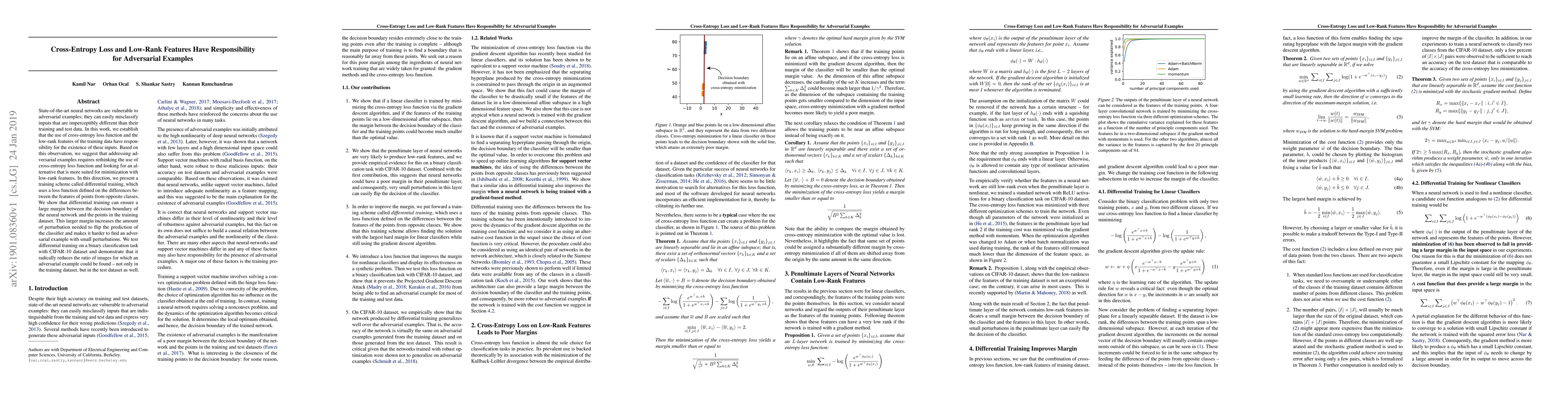 State-of-the-art neural networks are vulnerable to adversarial examples; they can easily misclassify inputs that are imperceptibly different than their training and test data. In this work, we establish that the use of cross-entropy loss function and the low-rank features of the training data have responsibility for the existence of these inputs. Based on this observation, we suggest that addressing adversarial examples requires rethinking the use of cross-entropy loss function and looking for an alternative that is more suited for minimization with low-rank features. In this direction, we present a training scheme called differential training, which uses a loss function defined on the differences between the features of points from opposite classes. We show that differential training can ensure a large margin between the decision boundary of the neural network and the points in the training dataset. This larger margin increases the amount of perturbation needed to flip the prediction of the classifier and makes it harder to find an adversarial example with small perturbations. We test differential training on a binary classification task with CIFAR-10 dataset and demonstrate that it radically reduces the ratio of images for which an adversarial example could be found -- not only in the training dataset, but in the test dataset as well.