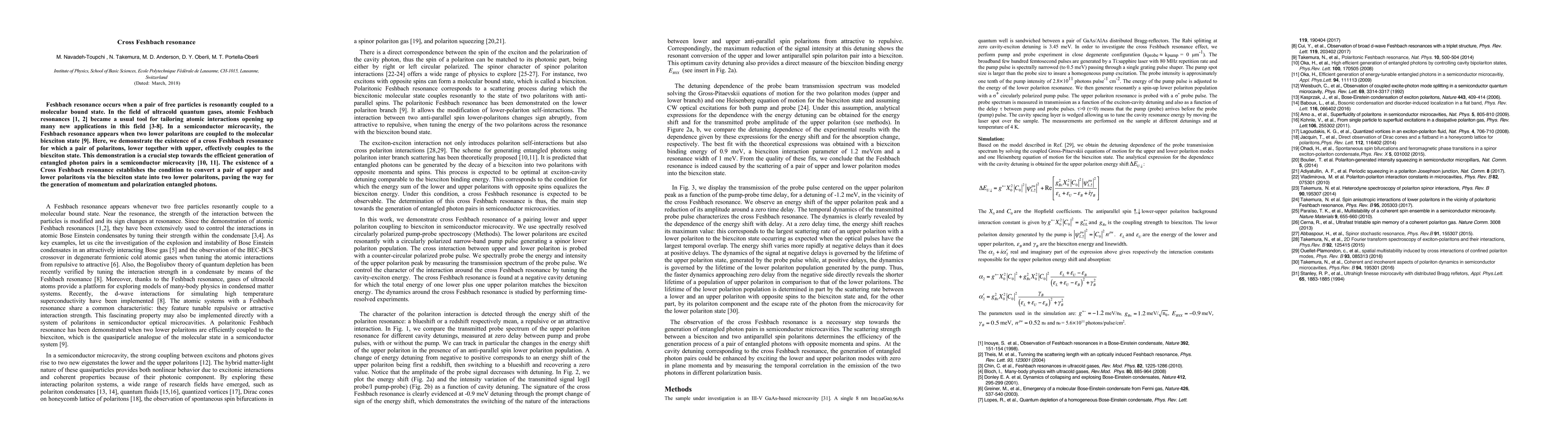 This paper demonstrates the existence of a cross Feshbach resonance in a semiconductor microcavity, where pairs of polaritons couple to a biexciton state, facilitating the generation of entangled photon pairs and paving the way for advanced quantum applications.