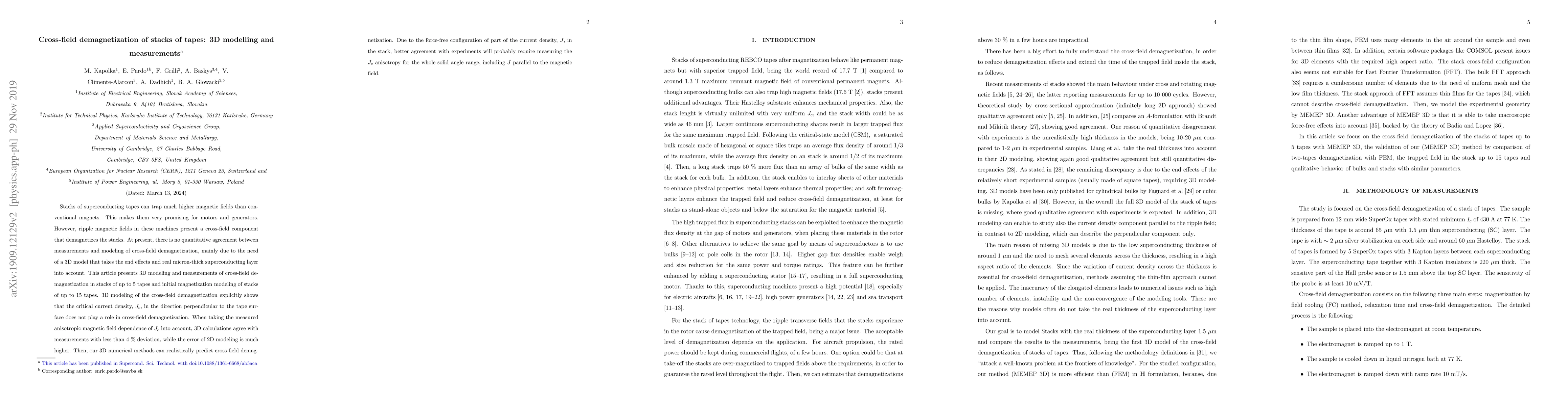 This paper presents a 3D model for cross-field demagnetization in stacks of superconducting tapes, showing that the critical current density perpendicular to the tape surface does not affect demagnetization. The 3D model, which accounts for end effects and micron-thick layers, agrees with measurements within 4% deviation, significantly improving upon 2D modeling.
