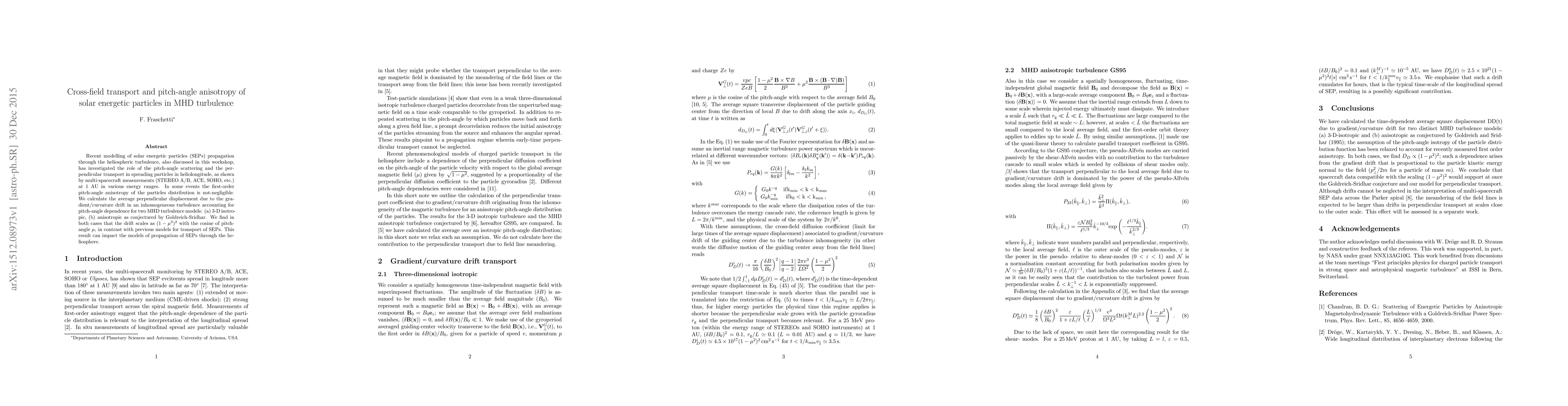 This paper investigates the cross-field transport and pitch-angle anisotropy of solar energetic particles in magnetohydrodynamic (MHD) turbulence, finding that the perpendicular drift scales as $(1-\mu^2)^2$ with pitch-angle $\mu$, differing from previous models and impacting SEP propagation models.