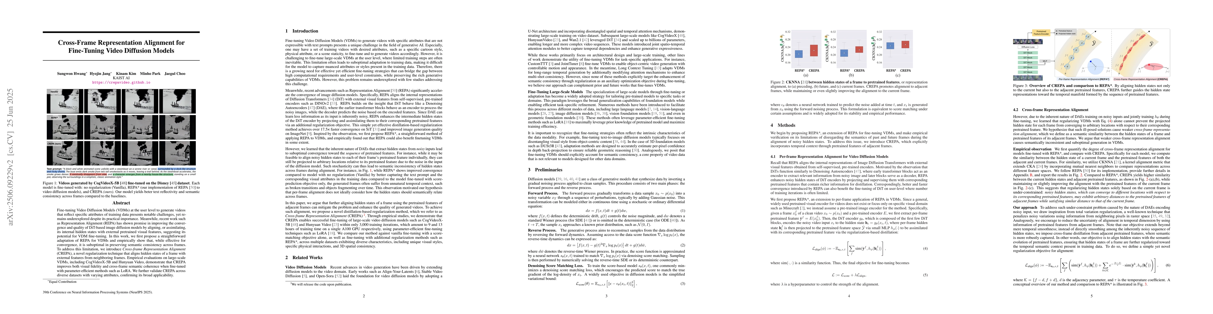This paper introduces Cross-Frame Representation Alignment (CREPA) for fine-tuning Video Diffusion Models, improving visual fidelity and cross-frame semantic coherence while adapting to user-level attributes.
