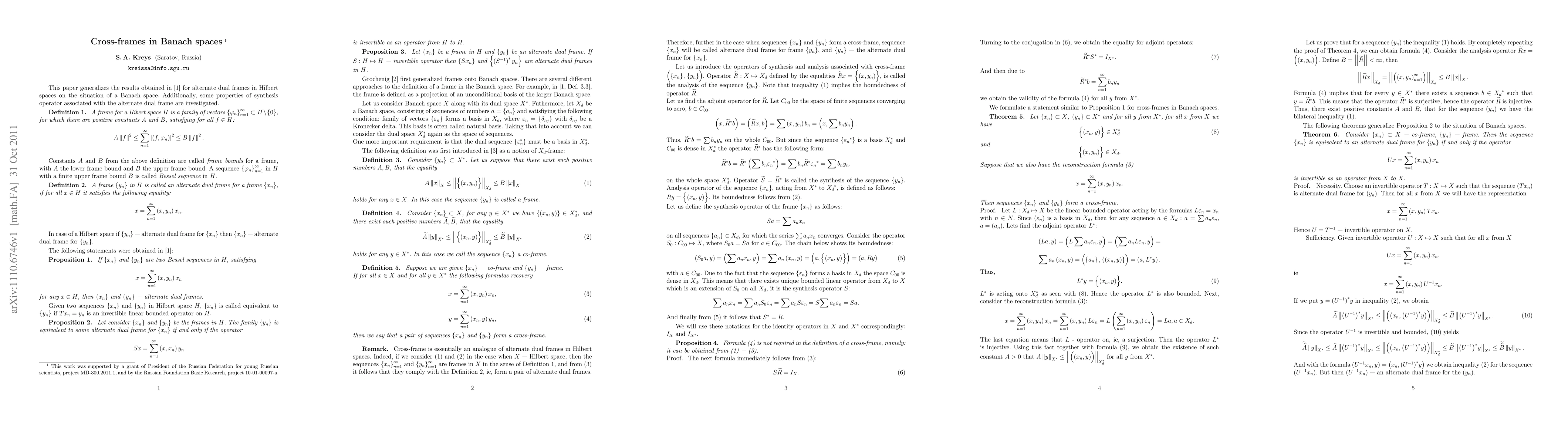 This paper extends findings on alternate dual frames from Hilbert spaces to Banach spaces, investigating synthesis operator properties and proving the absence of a strongly continuous uniformly bounded one-parameter group of operators whose eigenvectors include vectors from a given cross-frame in Banach space.