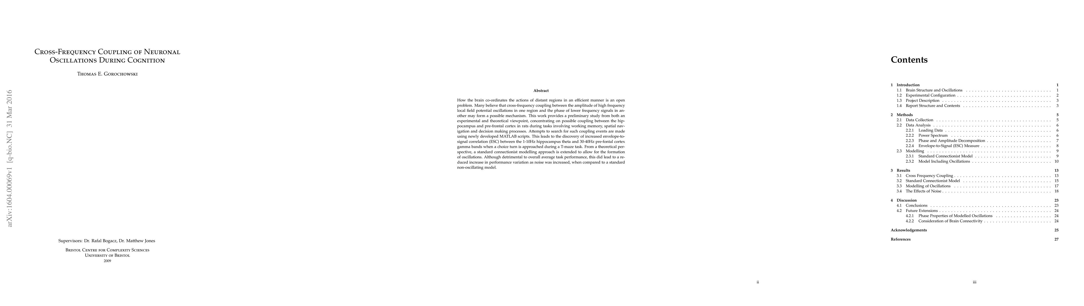 How the brain co-ordinates the actions of distant regions in an efficient manner is an open problem. Many believe that cross-frequency coupling between the amplitude of high frequency local field potential oscillations in one region and the phase of lower frequency signals in another may form a possible mechanism. This work provides a preliminary study from both an experimental and theoretical viewpoint, concentrating on possible coupling between the hippocampus and pre-frontal cortex in rats during tasks involving working memory, spatial navigation and decision making processes. Attempts to search for such coupling events are made using newly developed MATLAB scripts. This leads to the discovery of increased envelope-to-signal correlation (ESC) between the 1-10 Hz hippocampus theta and 30-40 Hz pre-fontal cortex gamma bands when a choice turn is approached during a T-maze task. From a theoretical perspective, a standard connectionist modelling approach is extended to allow for the formation of oscillations. Although detrimental to overall average task performance, this did lead to a reduced increase in performance variation as noise was increased, when compared to a standard non-oscillating model.