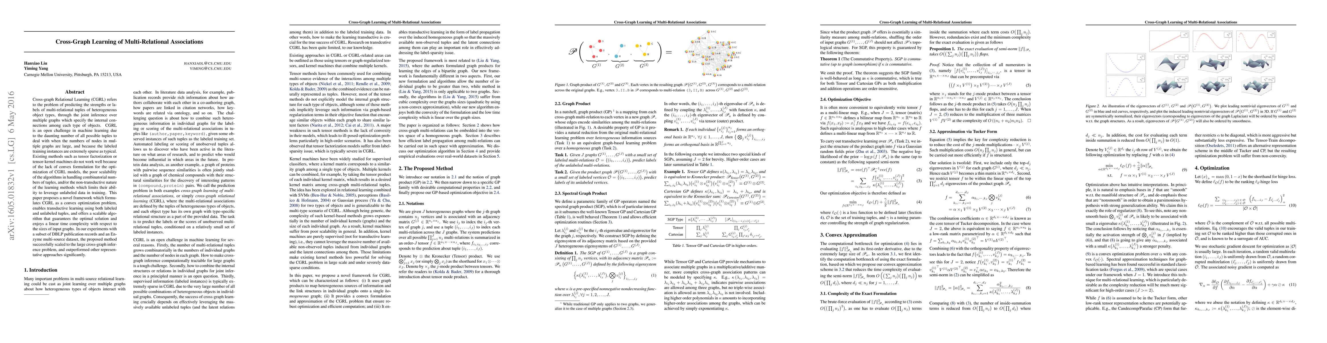 A new framework is proposed to solve the Cross-Graph Relational Learning problem, which involves predicting multi-relational associations across multiple heterogeneous graphs, with improved scalability and convex optimization.