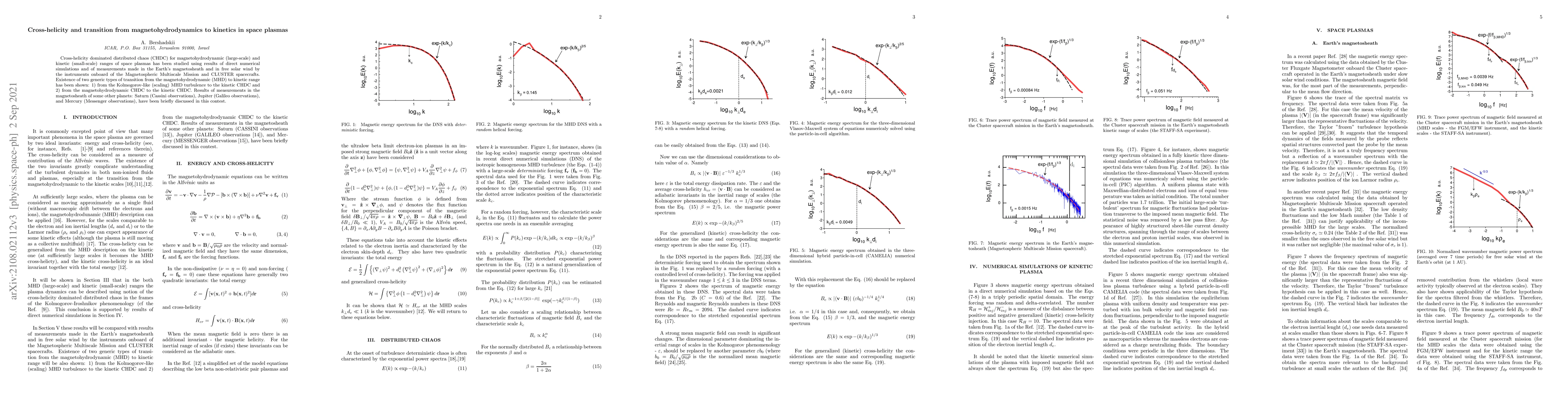 This paper investigates the transition from magnetohydrodynamic to kinetic regimes in space plasmas, focusing on cross-helicity and chaos. It reveals two types of transitions: from Kolmogorov-like MHD turbulence to kinetic cross-helicity dominated chaos, and from magnetohydrodynamic to kinetic cross-helicity dominated chaos, using data from various spacecraft missions.