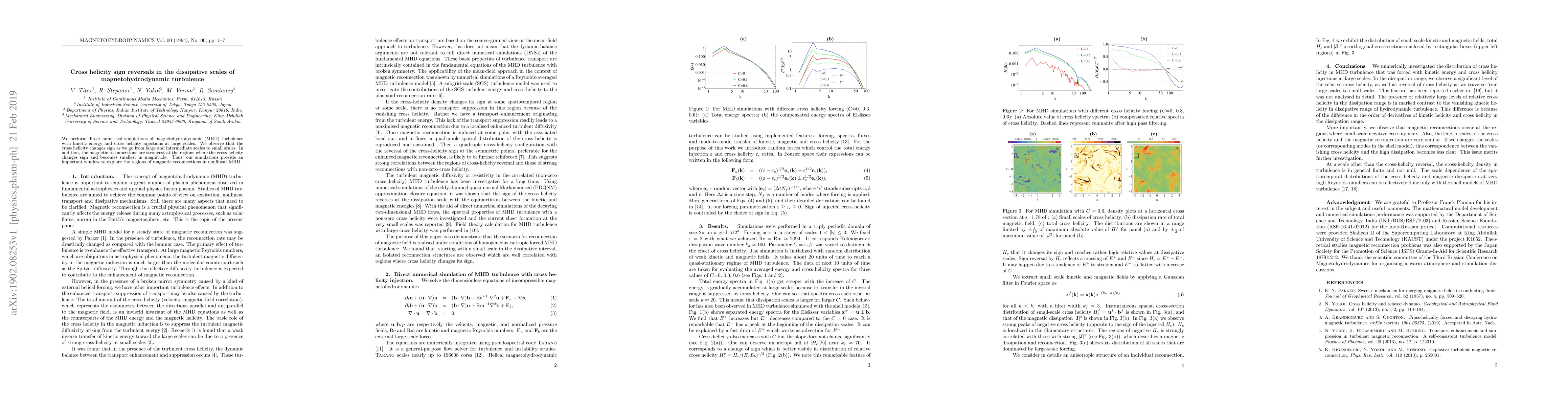 Summary: Direct numerical simulations reveal that cross helicity in MHD turbulence reverses sign from large to small scales, with strongest magnetic reconnections occurring in regions where cross helicity changes sign and diminishes.