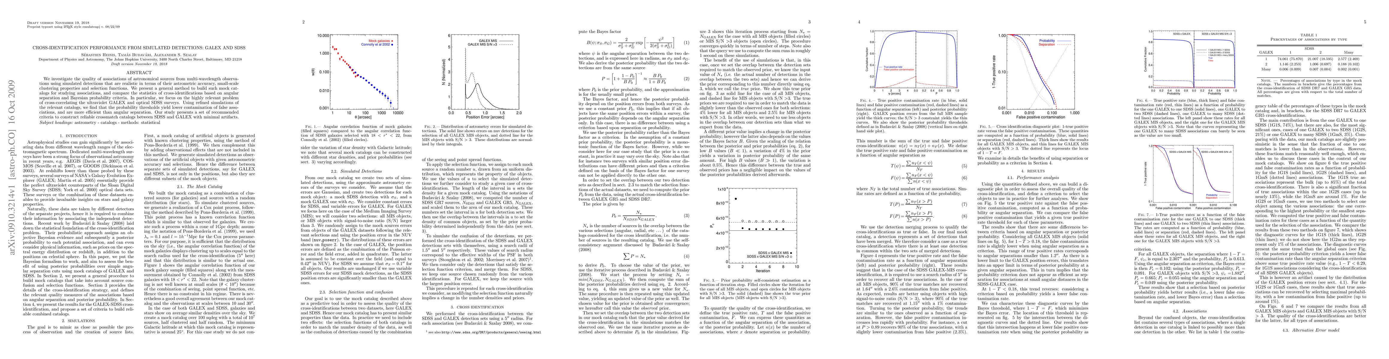 This study investigates cross-identification performance between GALEX and SDSS surveys using simulated detections, finding that probability thresholds are more efficient than angular separation in reducing false associations.