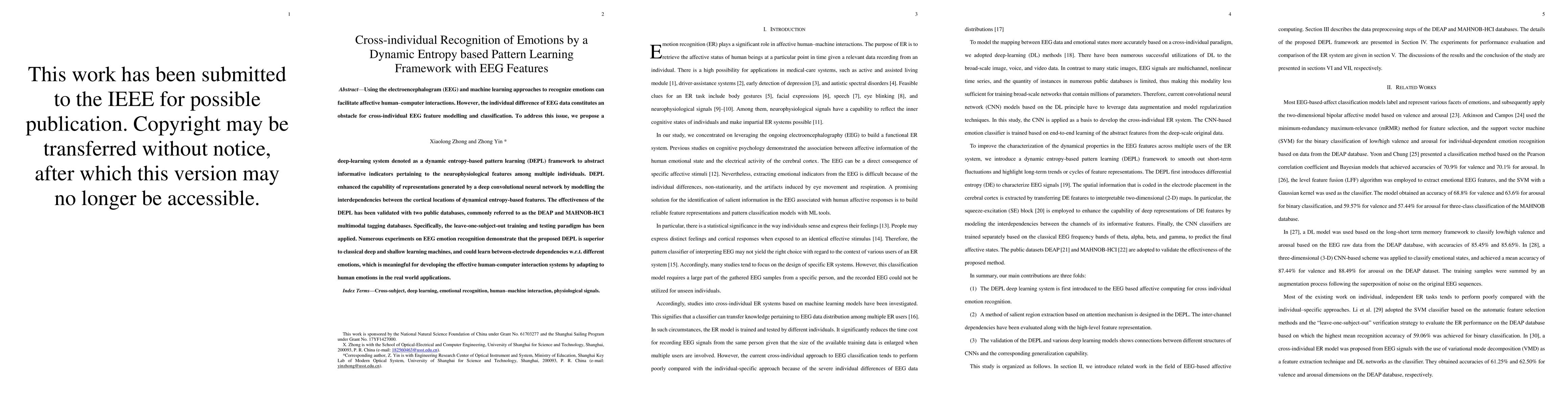 This paper proposes a dynamic entropy-based pattern learning (DEPL) framework using deep learning and EEG features to recognize emotions across different individuals. The DEPL model enhances deep convolutional neural networks by modeling interdependencies between cortical locations, demonstrating superior performance over traditional machine learning methods in cross-individual EEG emotion recognition.