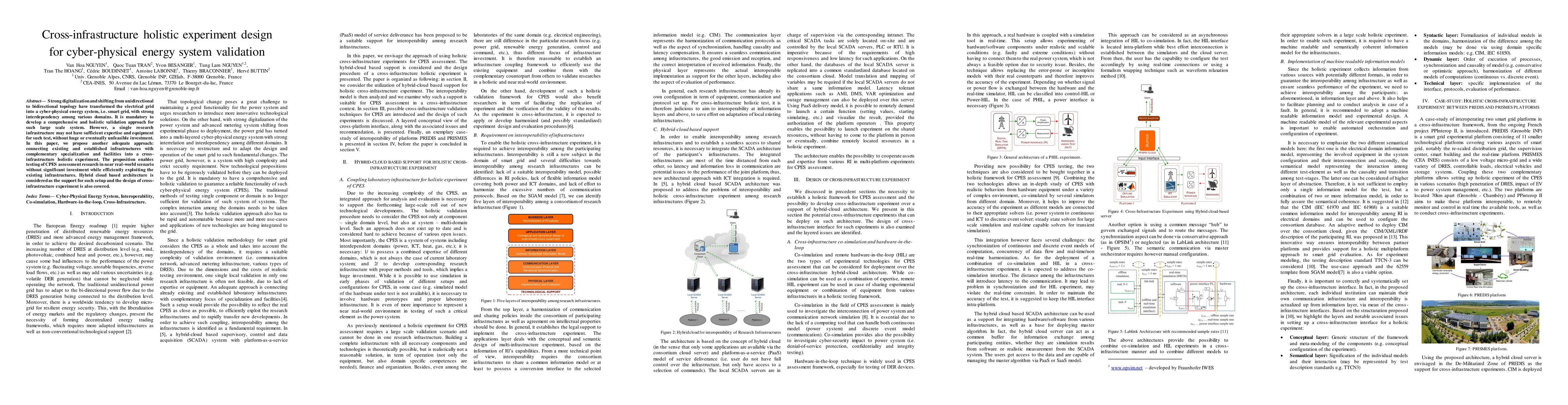 Strong digitalization and shifting from unidirectional to bidirectional topology have transformed the electrical grid into a cyber-physical energy system, i.e. smart grid, with strong interdependency among various domains. It is mandatory to develop a comprehensive and holistic validation approach for such large scale system. However, a single research infrastructure may not have sufficient expertise and equipment for such test, without huge or eventually unfeasible investment. In this paper, we propose another adequate approach: connecting existing and established infrastructures with complementary specialization and facilities into a cross-infrastructure holistic experiment. The proposition enables testing of CPES assessment research in near real-world scenario without significant investment while efficiently exploiting the existing infrastructures. Hybrid cloud based architecture is considered as the support for such setup and the design of cross-infrastructure experiment is also covered.