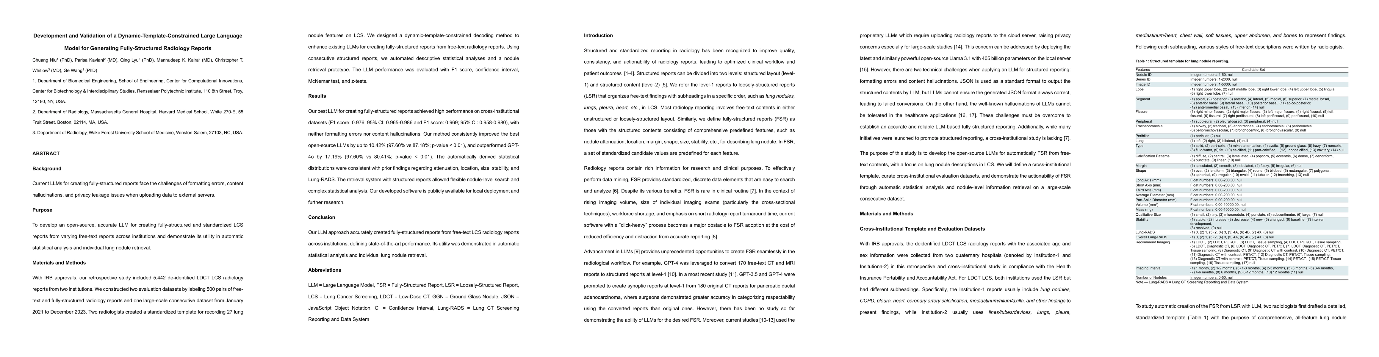 This research developed an enhanced open-source large language model (LLM) to create structured lung cancer screening reports with a template-constrained decoding approach, achieving improved performance without formatting errors or hallucinations. The model outperformed existing LLMs and enabled a prototype nodule retrieval system.