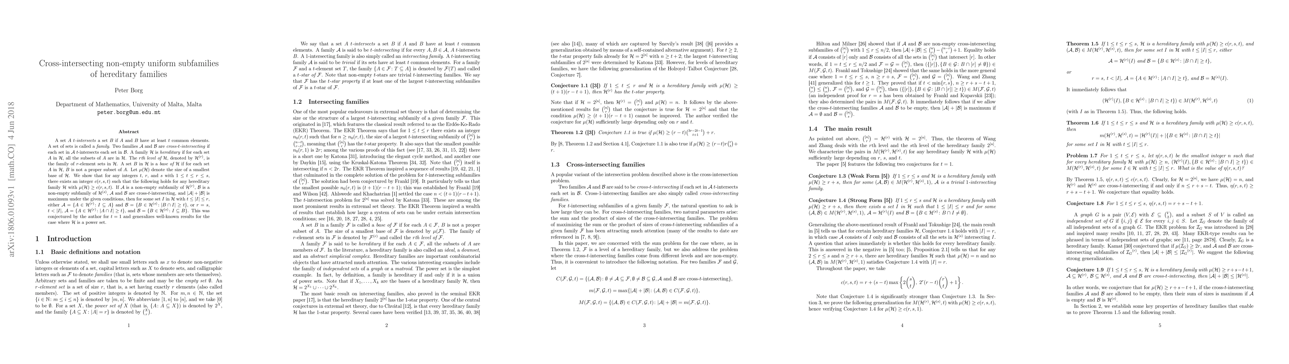 This paper presents a solution to a conjecture regarding cross-$t$-intersecting non-empty uniform subfamilies of hereditary families. It establishes the existence of an integer $c(r,s,t)$, dependent on $r$, $s$, and $t$, ensuring that for hereditary families $mathcal{H}$ with $mu(mathcal{H}) geq c(r,s,t)$, certain conditions on subfamilies $mathcal{A}$ and $mathcal{B}$ lead to specific configurations, generalizing known results for power sets.