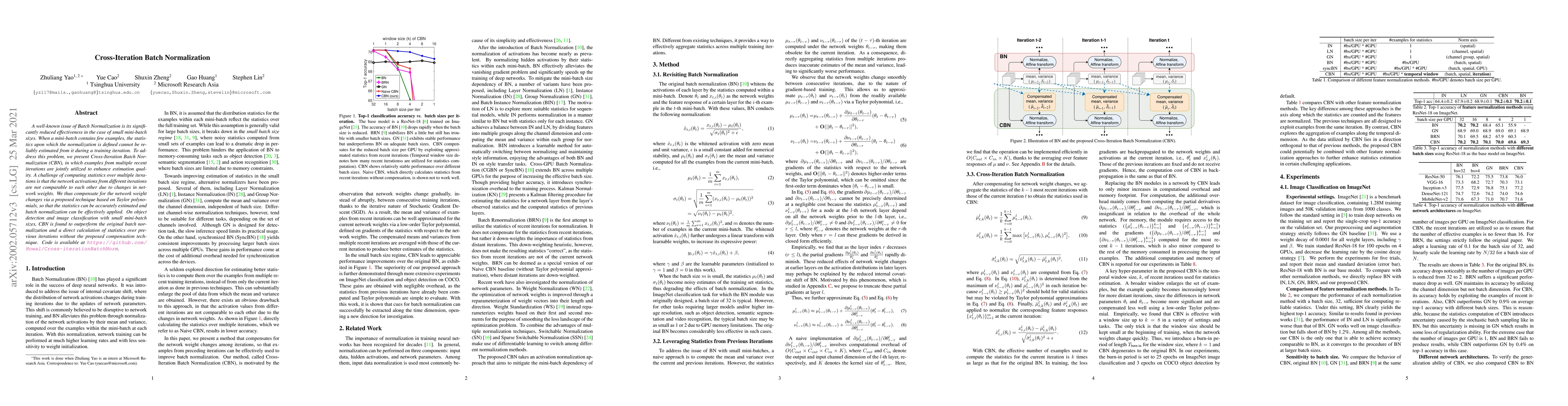 Cross-Iteration Batch Normalization (CBN) addresses the ineffectiveness of Batch Normalization in small mini-batch sizes by using examples from multiple recent iterations to improve statistic estimation. A novel technique based on Taylor polynomials compensates for weight changes between iterations, enabling effective batch normalization.
