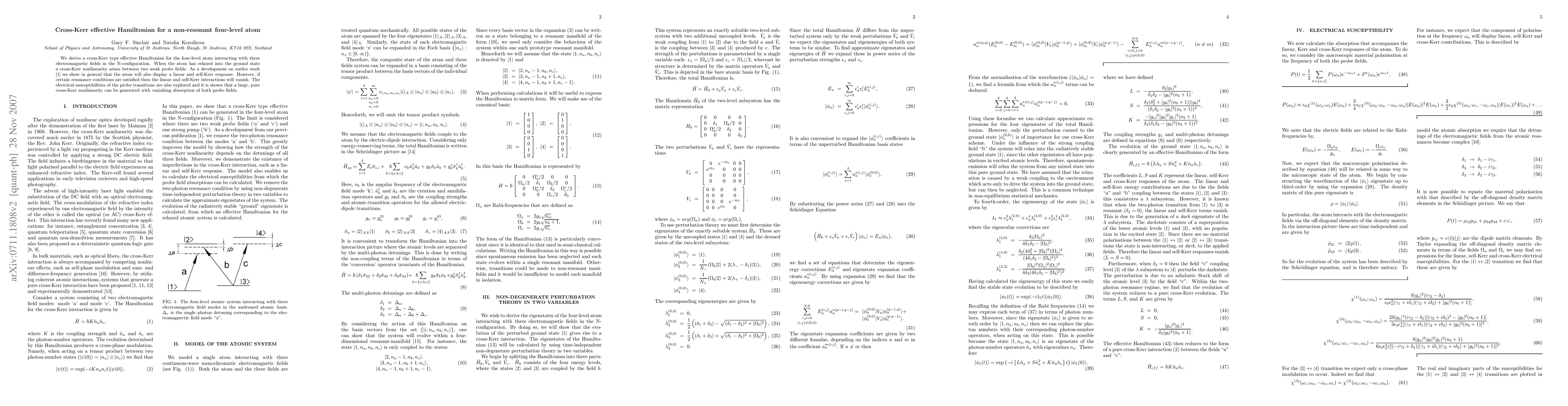 We derive a cross-Kerr type effective Hamiltonian for the four-level atom interacting with three electromagnetic fields in the N-configuration. When the atom has relaxed into the ground state a cross-Kerr nonlinearity arises between two weak probe fields. As a development on earlier work we show in general that the atom will also display a linear and self-Kerr response. However, if certain resonance conditions are satisfied then the linear and self-Kerr interactions will vanish. The electrical susceptibilities of the probe transitions are also explored and it is shown that a large, pure cross-Kerr nonlinearity can be generated with vanishing absorption of both probe fields.