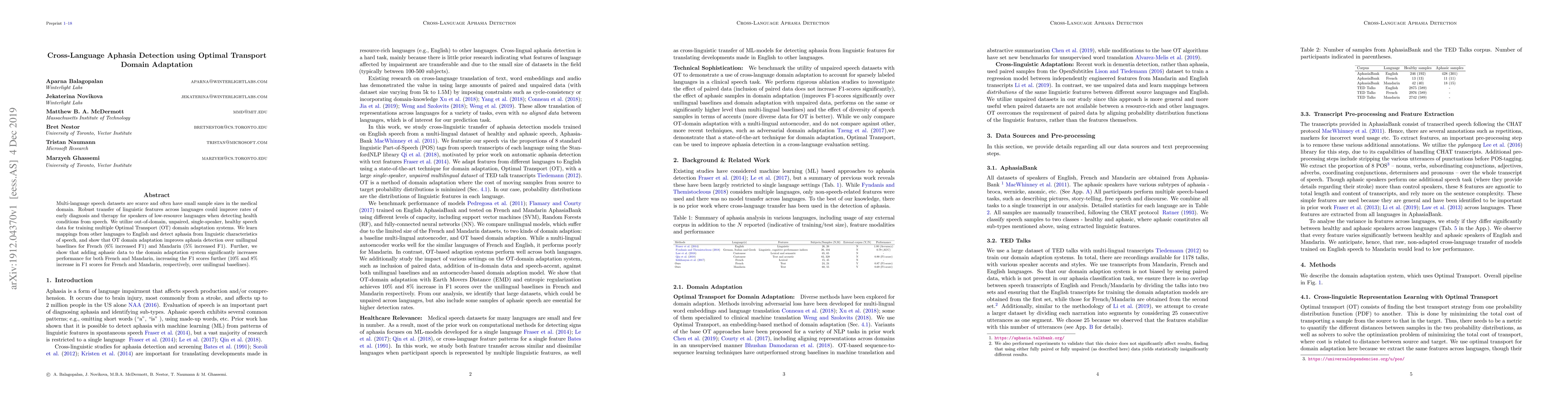 Multi-language speech datasets are scarce and often have small sample sizes in the medical domain. Robust transfer of linguistic features across languages could improve rates of early diagnosis and therapy for speakers of low-resource languages when detecting health conditions from speech. We utilize out-of-domain, unpaired, single-speaker, healthy speech data for training multiple Optimal Transport (OT) domain adaptation systems. We learn mappings from other languages to English and detect aphasia from linguistic characteristics of speech, and show that OT domain adaptation improves aphasia detection over unilingual baselines for French (6% increased F1) and Mandarin (5% increased F1). Further, we show that adding aphasic data to the domain adaptation system significantly increases performance for both French and Mandarin, increasing the F1 scores further (10% and 8% increase in F1 scores for French and Mandarin, respectively, over unilingual baselines).