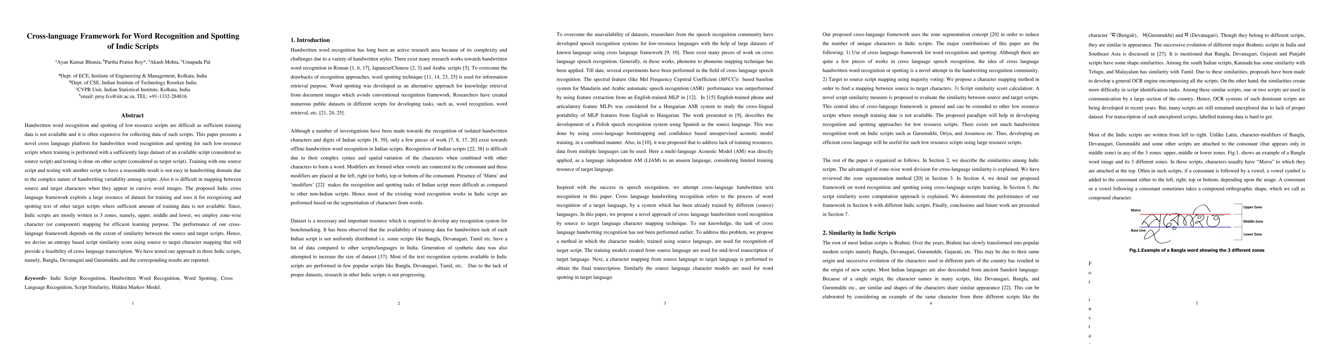 This paper introduces a cross-language framework for recognizing and spotting words in low-resource Indic scripts using a large dataset from a related script. It employs zone-wise character mapping and entropy-based script similarity scoring to achieve efficient cross-language transcription, tested across Bangla, Devanagari, and Gurumukhi scripts.