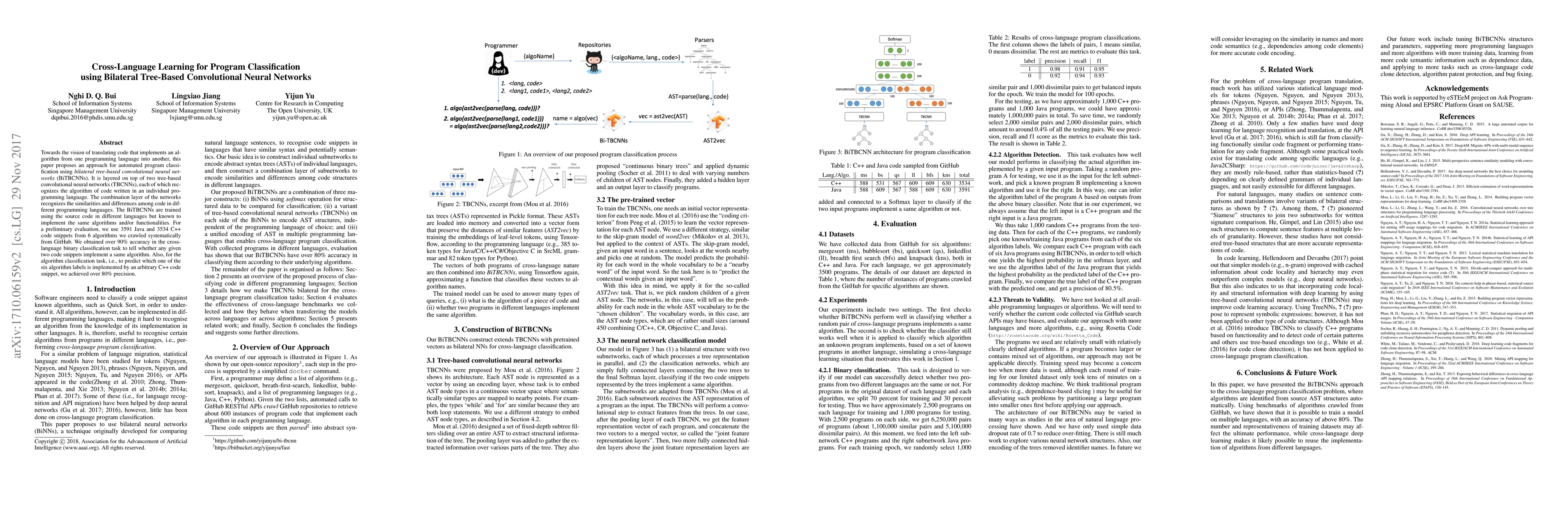This paper proposes a bilateral tree-based convolutional neural network (BiTBCNN) approach for automated program classification across different programming languages, achieving over 90% accuracy in cross-language binary classification and over 80% precision in algorithm classification.