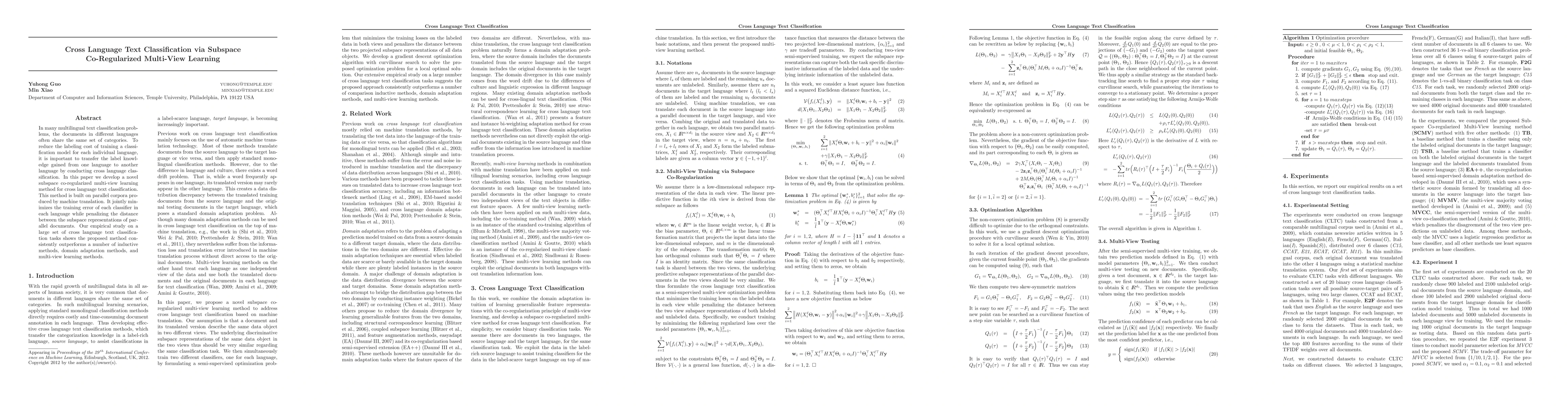 This paper introduces a novel subspace co-regularized multi-view learning method for cross language text classification, leveraging parallel corpora to transfer label knowledge across languages. The method outperforms existing inductive, domain adaptation, and multi-view learning approaches in empirical studies.