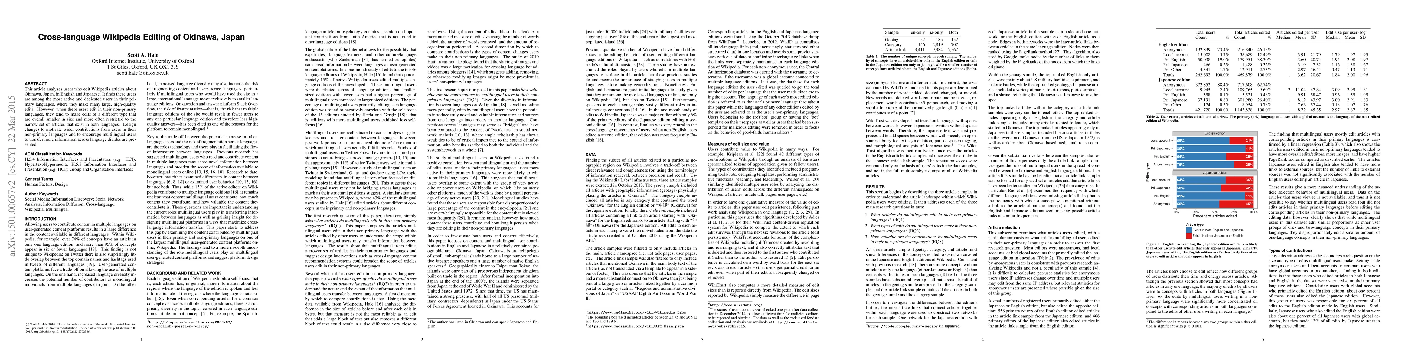 This article analyzes users who edit Wikipedia articles about Okinawa, Japan, in English and Japanese. It finds these users are among the most active and dedicated users in their primary languages, where they make many large, high-quality edits. However, when these users edit in their non-primary languages, they tend to make edits of a different type that are overall smaller in size and more often restricted to the narrow set of articles that exist in both languages. Design changes to motivate wider contributions from users in their non-primary languages and to encourage multilingual users to transfer more information across language divides are presented.