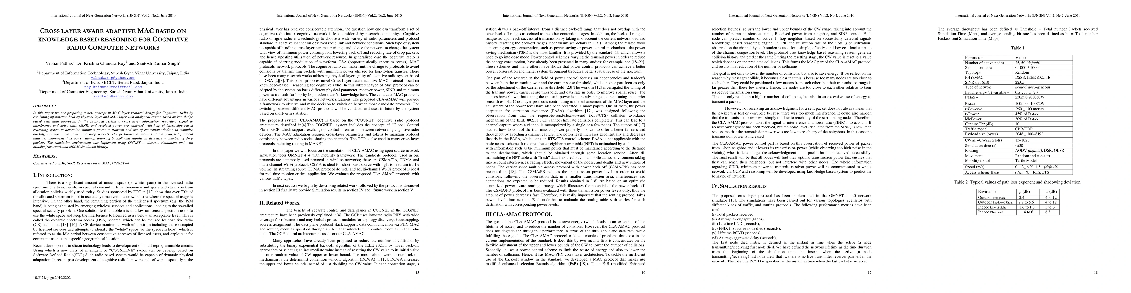 In this paper we are proposing a new concept in MAC layer protocol design for Cognitive radio by combining information held by physical layer and MAC layer with analytical engine based on knowledge based reasoning approach. In the proposed system a cross layer information regarding signal to interference and noise ratio (SINR) and received power are analyzed with help of knowledge based reasoning system to determine minimum power to transmit and size of contention window, to minimize backoff, collision, save power and drop packets. The performance analysis of the proposed protocol indicates improvement in power saving, lowering backoff and significant decrease in number of drop packets. The simulation environment was implement using OMNET++ discrete simulation tool with Mobilty framework and MiXiM simulation library.
