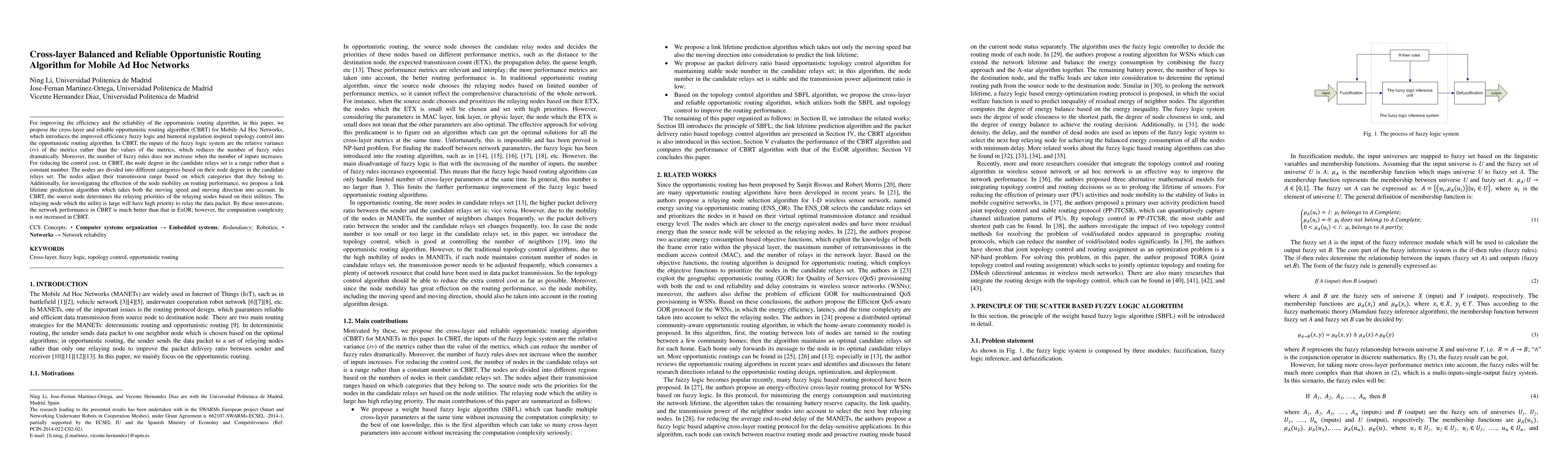 This paper proposes a cross-layer balanced and reliable opportunistic routing algorithm (CBRT) for Mobile Ad Hoc Networks, enhancing efficiency and reliability through improved fuzzy logic and adaptive topology control. CBRT reduces the number of fuzzy rules and control costs by categorizing nodes based on their degree in the candidate relays set, and introduces a link lifetime prediction algorithm to account for node mobility.