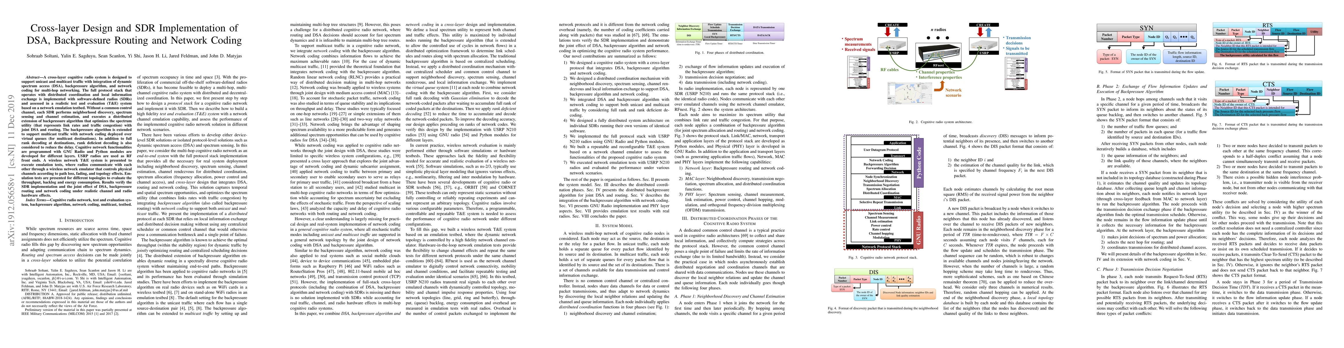 Researchers develop a cross-layer cognitive radio system that integrates dynamic spectrum access, backpressure routing, and network coding for multi-hop networking using software-defined radios, achieving improved throughput, backlog, and energy efficiency in realistic channel conditions.