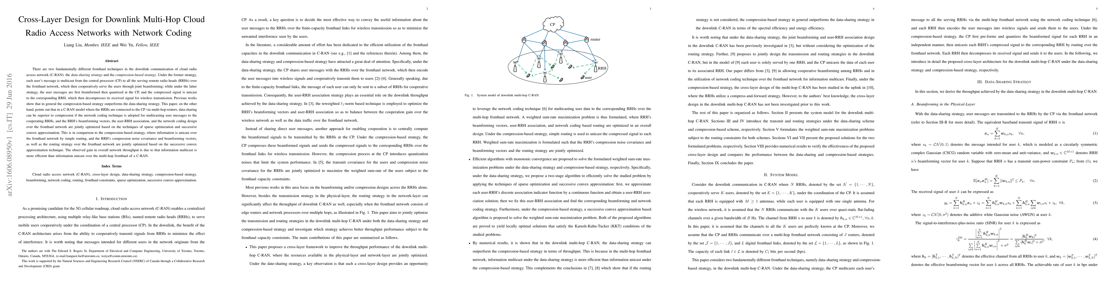 This paper explores cross-layer design for downlink multi-hop cloud radio access networks (C-RAN) using network coding, demonstrating that data-sharing can outperform compression-based strategies when network coding is employed for multicasting user messages, leading to higher overall network throughput compared to unicast routing.