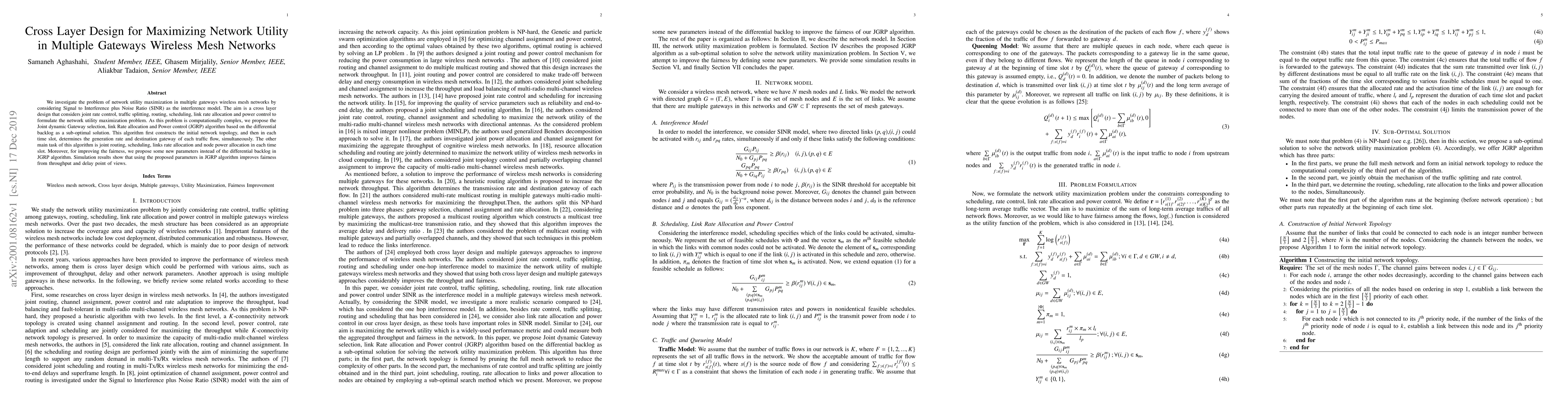 This paper proposes a cross-layer design algorithm, JGRP, for maximizing network utility in multiple gateways wireless mesh networks by integrating rate control, routing, scheduling, and power control. The JGRP algorithm optimizes throughput and fairness using differential backlog and alternative parameters, demonstrating improved performance in simulations.
