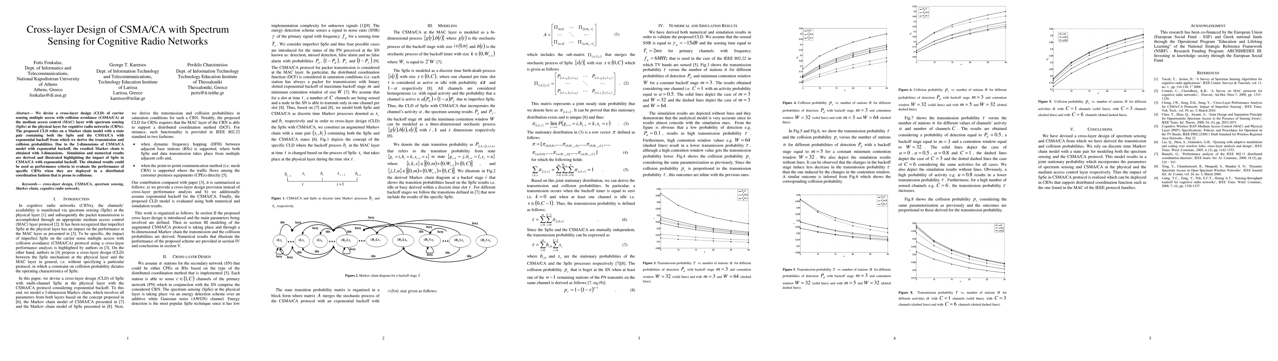 We devise a cross-layer design (CLD) of carrier sensing multiple access with collision avoidance (CSMA/CA) at the medium access control (MAC) layer with spectrum sensing (SpSe) at the physical layer for cognitive radio networks (CRNs). The proposed CLD relies on a Markov chain model with a state pair containing both the SpSe and the CSMA/CA with exponential backoff from which we derive the transmission and collision probabilities. Due to the 2-dimensions of CSMA/CA model with exponential backoff, the resulted Markov chain is obtained with 3-dimensions. Simulation and numerical results are derived and illustrated highlighting the impact of SpSe in CSMA/CA with exponential backoff. The obtained results could be used as performance criteria to evaluate the performance of specific CRNs when they are deployed in a distributed coordination fashion that is prone to collisions.