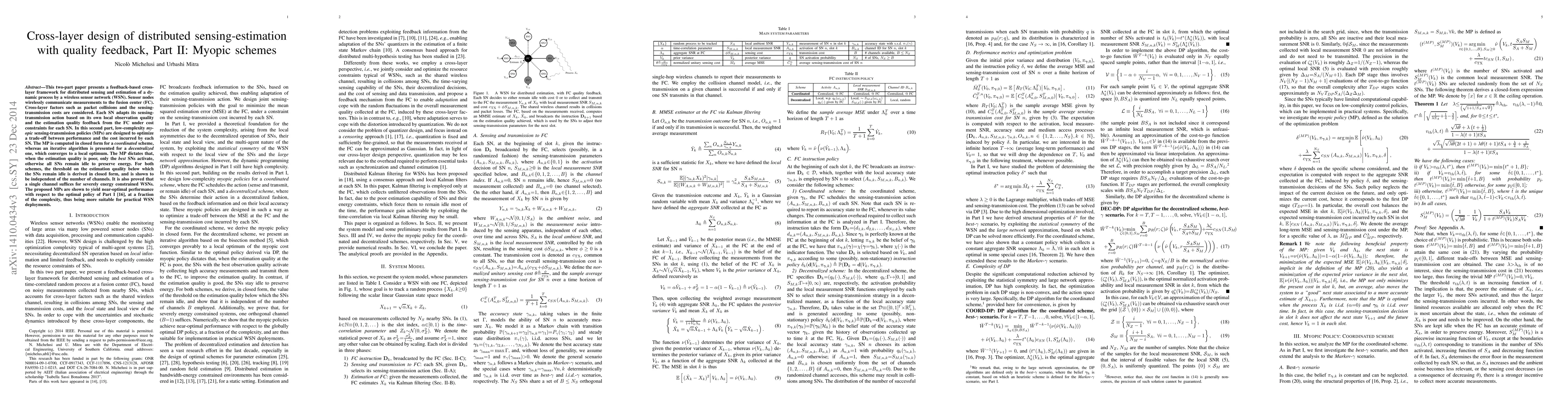 This two-part paper presents a feedback-based cross-layer framework for distributed sensing and estimation of a dynamic process by a wireless sensor network (WSN). Sensor nodes wirelessly communicate measurements to the fusion center (FC). Cross-layer factors such as packet collisions and the sensing-transmission costs are considered. Each SN adapts its sensing-transmission action based on its own local observation quality and the estimation quality feedback from the FC under cost constraints for each SN. In this second part, low-complexity myopic sensing-transmission policies (MPs) are designed to optimize a trade-off between performance and the cost incurred by each SN. The MP is computed in closed form for a coordinated scheme, whereas an iterative algorithm is presented for a decentralized one, which converges to a local optimum. The MP dictates that, when the estimation quality is poor, only the best SNs activate, otherwise all SNs remain idle to preserve energy. For both schemes, the threshold on the estimation quality below which the SNs remain idle is derived in closed form, and is shown to be independent of the number of channels. It is also proved that a single channel suffices for severely energy constrained WSNs. The proposed MPs are shown to yield near-optimal performance with respect to the optimal policy of Part I, at a fraction of the complexity, thus being more suitable for practical WSN deployments.