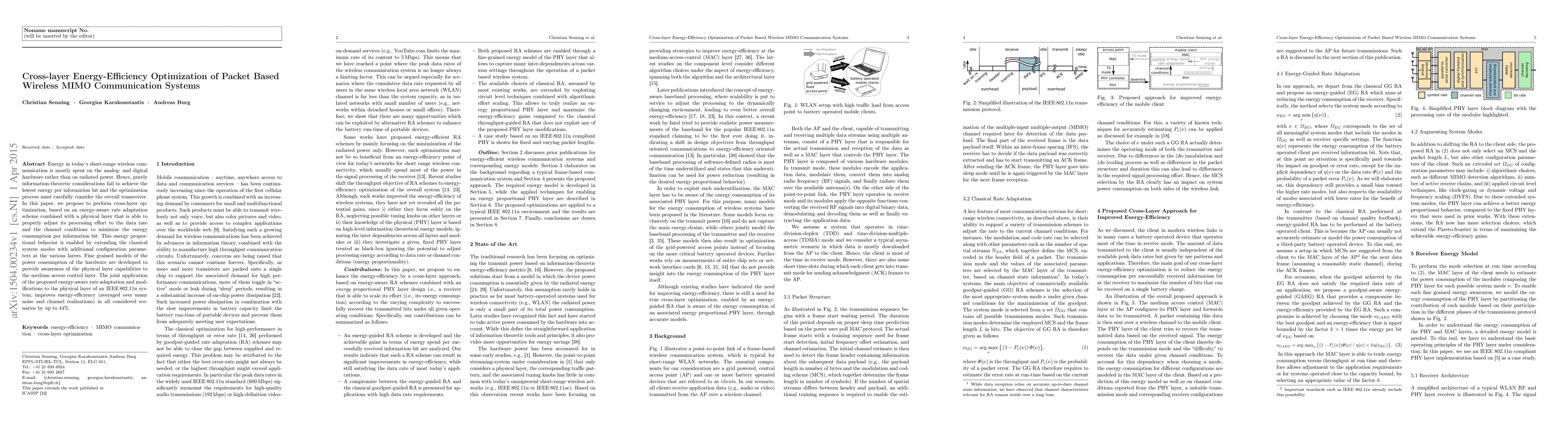 This paper proposes a cross-layer optimization for energy-efficient wireless MIMO communication, integrating an energy-aware rate adaptation scheme with adaptive physical layer processing. The approach enhances energy-efficiency by up to 44% across various scenarios by leveraging detailed power consumption models and extending system modes with additional configuration parameters.
