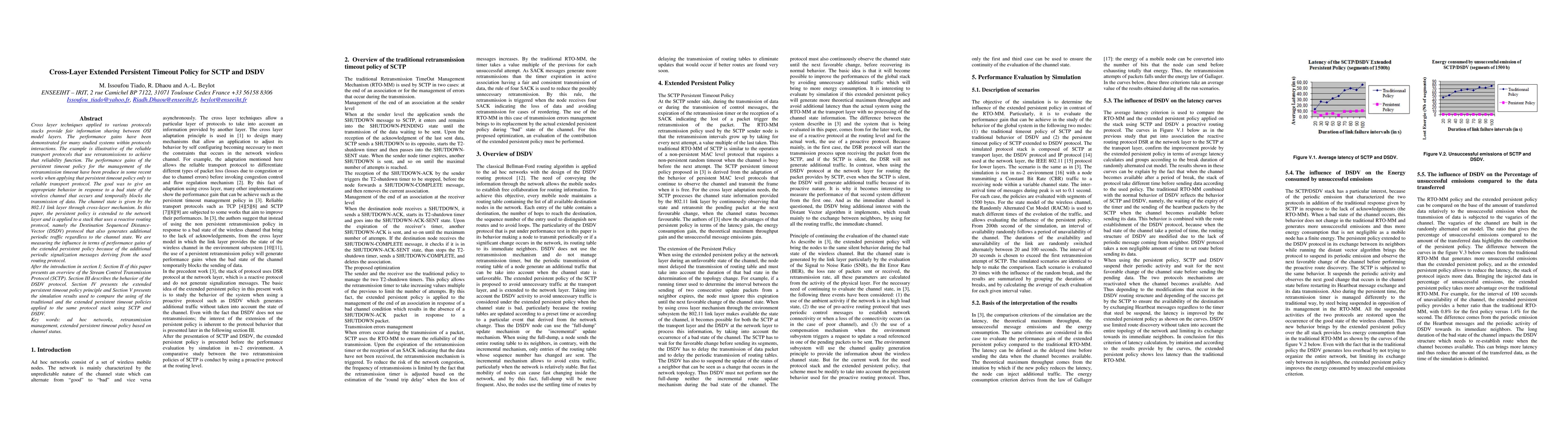 Cross layer techniques applied to various protocols stacks provide fair information sharing between OSI model layers. The performance gains have been demonstrated for many studied systems within protocols interactions. The example is illustrative of the reliable transport protocols that use retransmissions to achieve that reliability function. The performance gains of the persistent timeout policy for the management of the retransmission timeout have been produce in some recent works when applying that persistent timeout policy only to reliable transport protocol. The goal was to give an appropriate behavior in response to a bad state of the wireless channel that occurs and temporally blocks the transmission of data. The channel state is given by the 802.11 link layer through cross-layer mechanism. In this paper, the persistent policy is extended to the network layer and is applied to a stack that uses a reactive routing protocol, namely the Destination Sequenced Distance-Vector (DSDV) protocol that also generates additional periodic traffic regardless to the channel state. We are measuring the influence in terms of performance gains of the extended persistent policy because of the additional periodic signalization messages deriving from the used routing protocol. After the introduction in section I; Section II of this paper presents an overview of the Stream Control Transmission Protocol (SCTP). Section III describes the behavior of the DSDV protocol. Section IV presents the extended persistent timeout policy principle and Section V presents the simulation results used to compare the using of the traditional and the extended persistent timeout policies applied to the same protocol stack using SCTP and DSDV.